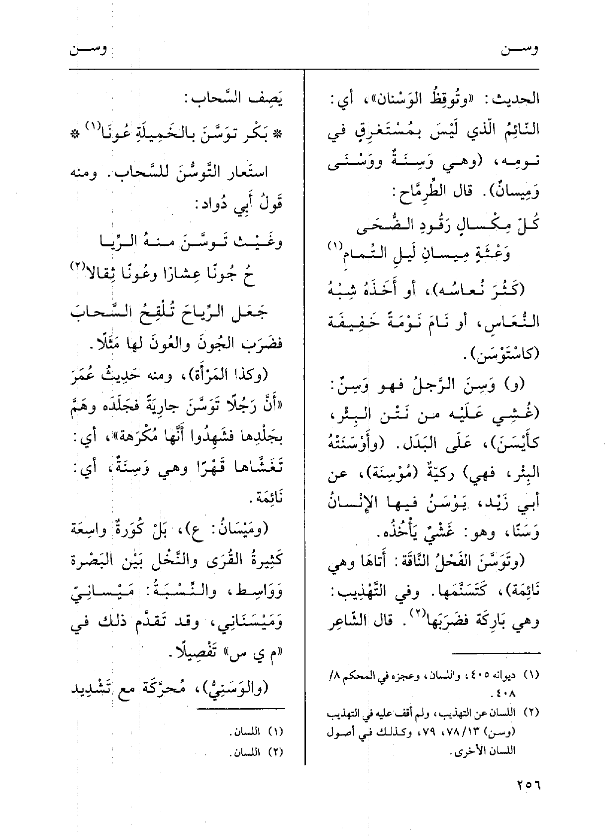 بِكْر {تَوَسَّنَ بالخَمِيلَةِ عُونا اسْتَعارَ} التَّوَسُّنَ للسَّحابِ؛ وَمِنْه قوْلُ أَبي دُوَاد: