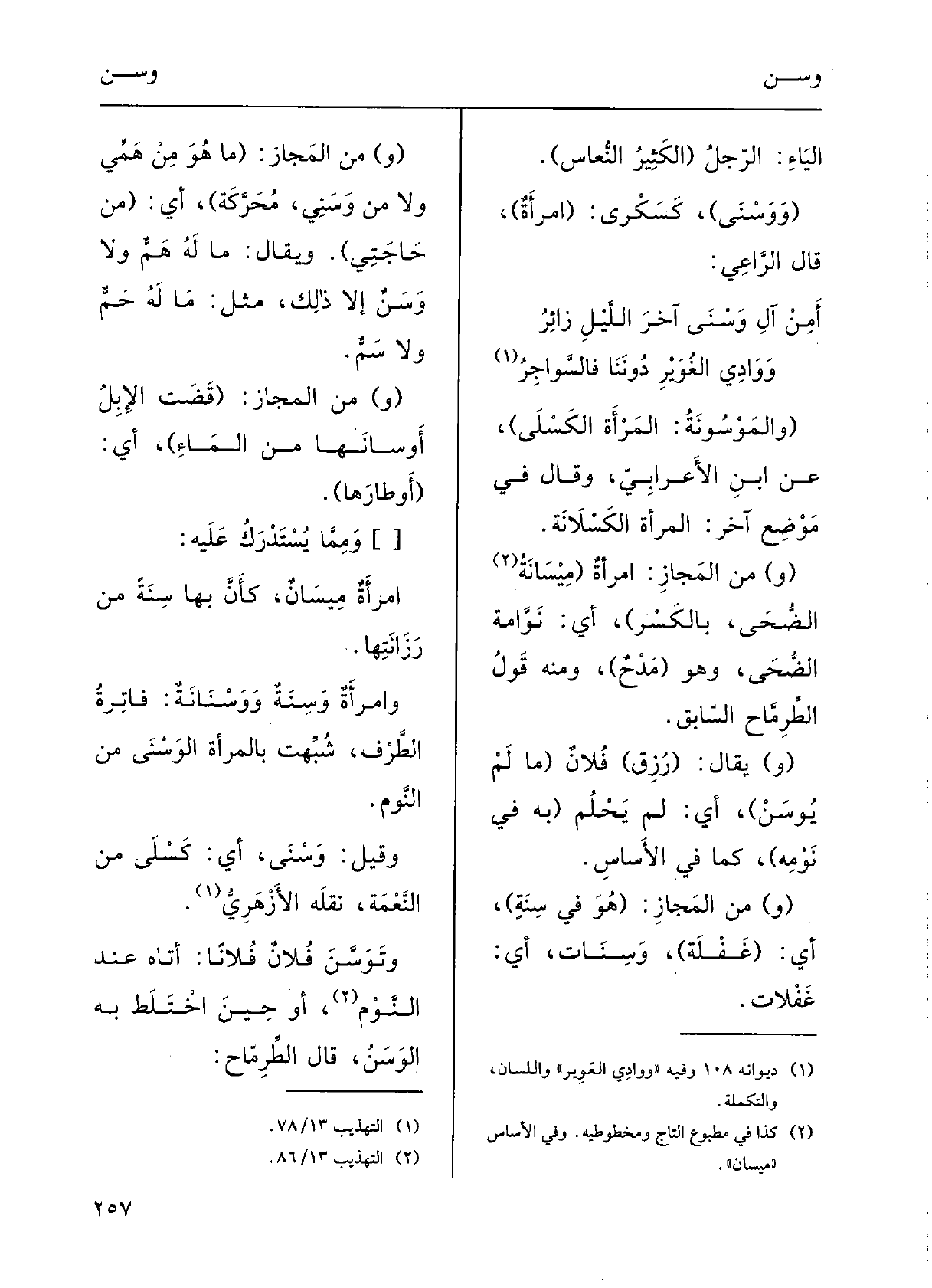 أَمِنْ آلِ} وَسْنَى آخرَ الليلِ زائرُووادي الغُوَيْر دُونَنَا فالسَّواجِرُ؟ ( {والمَوْسونَةُ: المرأَةُ الكَسْلَى) ؛) عَن ابنِ الأعْرابيِّ، وقالَ فِي موْضِعٍ آخر: المرْأَةُ الكَسْلانَةُ.