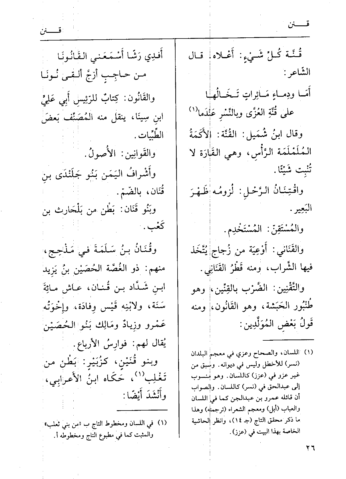 وبنُو! قُنَيْنٍ، كزُبَيْرٍ: بَطْنٌ من تَغْلب، حَكَاه ابنُ الأعْرابيِّ؛ وأَنْشَدَ أَيْضاً:
