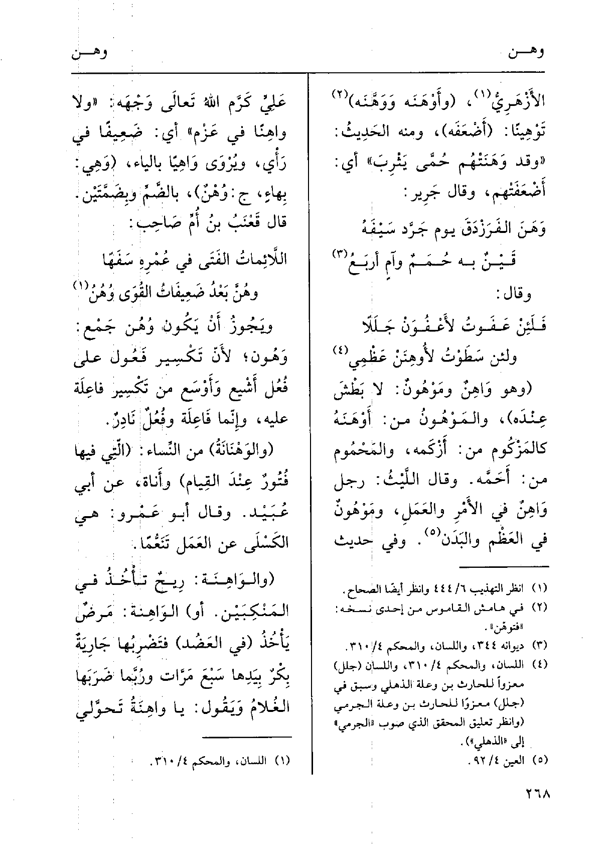 اللاَّئماتُ الفَتَى فِي عُمْرِه سَفَهاً وهُنَّ بَعدُ ضَعِيفاتُ القُوَى} وُهُن ُويَجوزُ أَنْ يكونَ وُهُن جَمْع {وَهُونٍ، لأنَّ تَكْسِيرَ فَعُول على فُعُل أَشْيَع وأَوْسَع مِن تَكْسِيرِ فاعِلَةٍ عَلَيْهِ، وإِنَّما فاعِلَةٌ وفُعُلٌ نادِرٌ.
