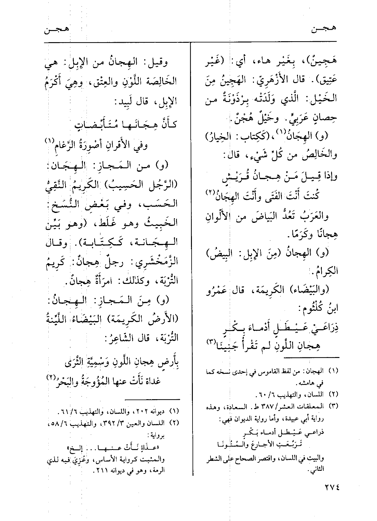 ذِرَاعَيْ عَبْطَلٍ أَدْماءَ بِكْرٍ هِجانِ اللَّوْنِ لم تَقْرأْ جَنِيناوقيلَ: الهِجانُ مِن الإِبِلِ هِيَ الخالِصَةُ اللّوْنِ والعِتْقِ، وَهِي أَكْرَمُ الإِبِلِ؛ قالَ لَبيدٌ: