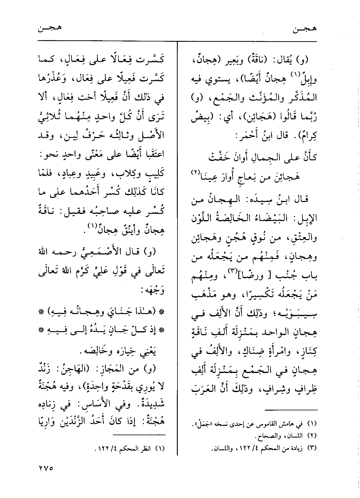 كأَنَّ على الجِمالِ أَوانَ خَفَّتْهَجائِنَ من نِعاجِ أُوارَعِيناقالَ ابنُ سِيدَه: الهِجانُ مِن الإِبِلِ البَيْضاءُ الخالِصَةُ اللَّوْنِ والعِتْقِ من نُوقٍ هُجُنٍ وهَجائِن وهِجانٍ، فَمنهمْ مَنْ يَجْعَله مِن بابِ جُنُبٍ، وَمِنْهُم مَنْ يَجْعَله تَكْسِيراً، وَهُوَ مَذْهَبُ سِيْبَوَيْه، وذلكَ أَنَّ الأَلِفَ فِي هِجانٍ الوَاحِد بمنْزِلَةِ أَلِفِ ناقَةٍ كِنَازٍ وامرأَةٍ ضِنَاكٍ، والأَلِفُ فِي هِجانٍ فِي الجَمْعِ بمنْزِلَةِ أَلِفِ ظِرافٍ وشِرَافٍ، وذلكَ أنَّ العَرَبَ كَسَّرَتْ فِعَالاً على فِعَالٍ، كَمَا كَسَّرَتْ فَعِيلاً على فِعَالٍ، وعُذْرُها فِي ذلكَ أَنَّ فَعِيلاً أُخْتُ فِعَالٍ، أَلا تَرَى أَنَّ كلَّ واحِدٍ مِنْهُمَا ثلاثيُّ الأصْلِ وثالِثُهُ حَرْفُ لينٍ؟ وَقد اعْتَقَبَا أَيْضاً على معْنًى واحِدٍ، نَحْو كَلِيبٍ وكِلابٍ وعَبِيدٍ وعِبَادٍ، فلمَّا كَانَ كذلِكَ كُسّر أَحَدُهما على مَا كُسِّرَ عَلَيْهِ صاحِبُه فقيلَ: ناقَةٌ هِجانٌ وأَيْنُقٌ هِجانٌ.