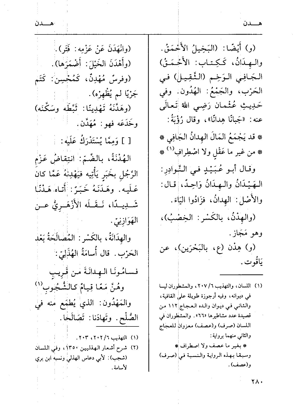 فسامُونا الهِدَانَةَ من قريبٍ وهُنَّ مَعًا قيامٌ كالشُّجُوبِوالمَهْدُونُ: الَّذِي يُطْمَعُ مِنْهُ فِي الصلْحِ.