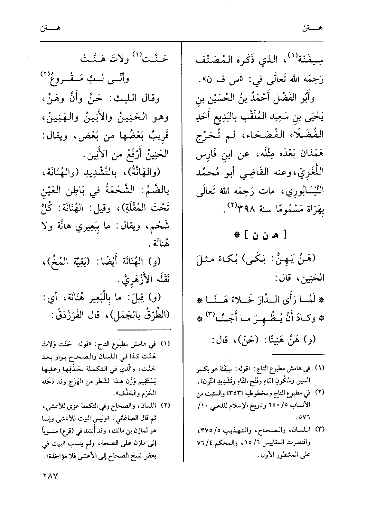 حَنَّتْ ولاتَ هَنَّتْوأَنِّي لكِ مَقْرُوعُوقالَ اللَّيثُ: حَنَّ وأَنَّ} وهَنَّ وَهُوَ الحَنِينُ والأنِينُ {والهَنِينُ، قَرِيبٌ بَعْضها مِن بعضٍ. ويقالُ: الحَنِينُ أَرْفَعُ مِن الأنينِ.