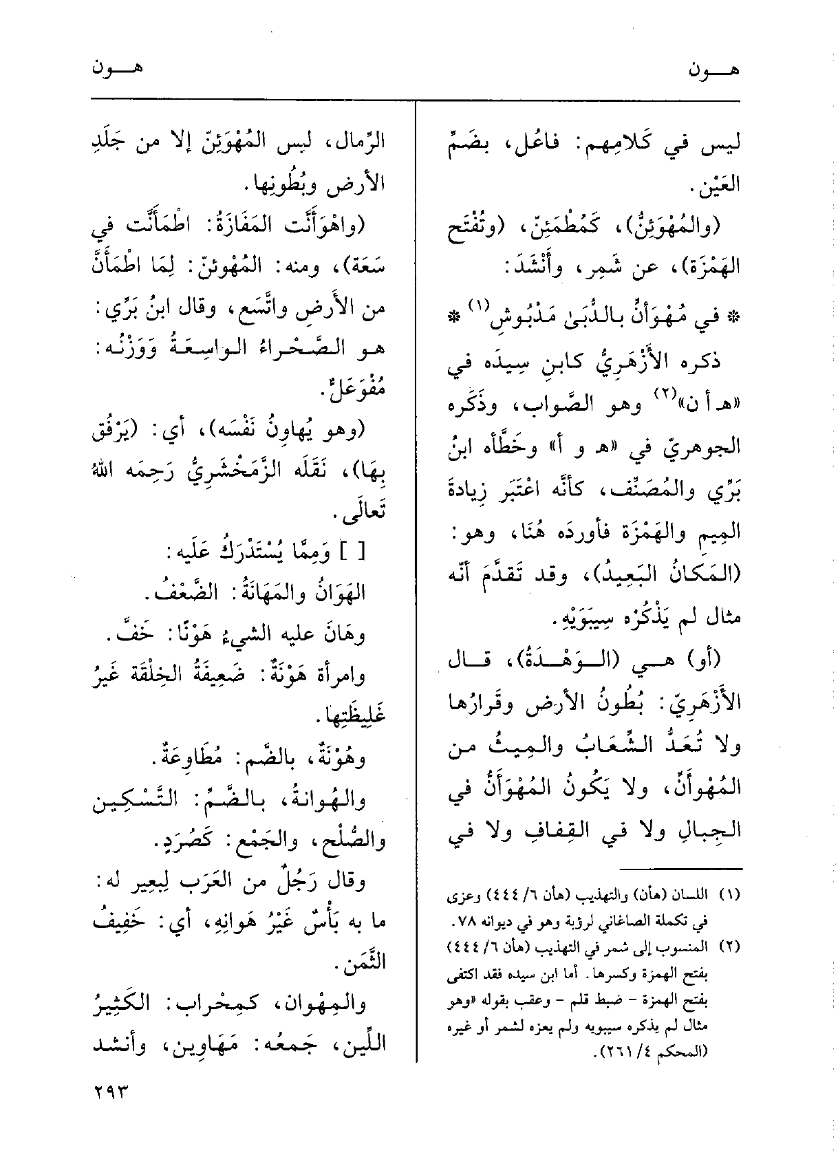 (قالَ الأَزْهرِيُّ: بُطونُ الأَرْضِ وقَرارُها، وَلَا تُعَدُّ الشِّعابُ والمِيْثُ مِن المُهْوَئِنِّ، وَلَا يكونُ المِهْوَئِنّ فِي الجِبالِ وَلَا فِي القِفافِ وَلَا فِي الرِّمالِ، ليسَ المُهْوَئِنّ إلاَّ مِن جَلَدِ الأرْضِ وبُطونِها.
