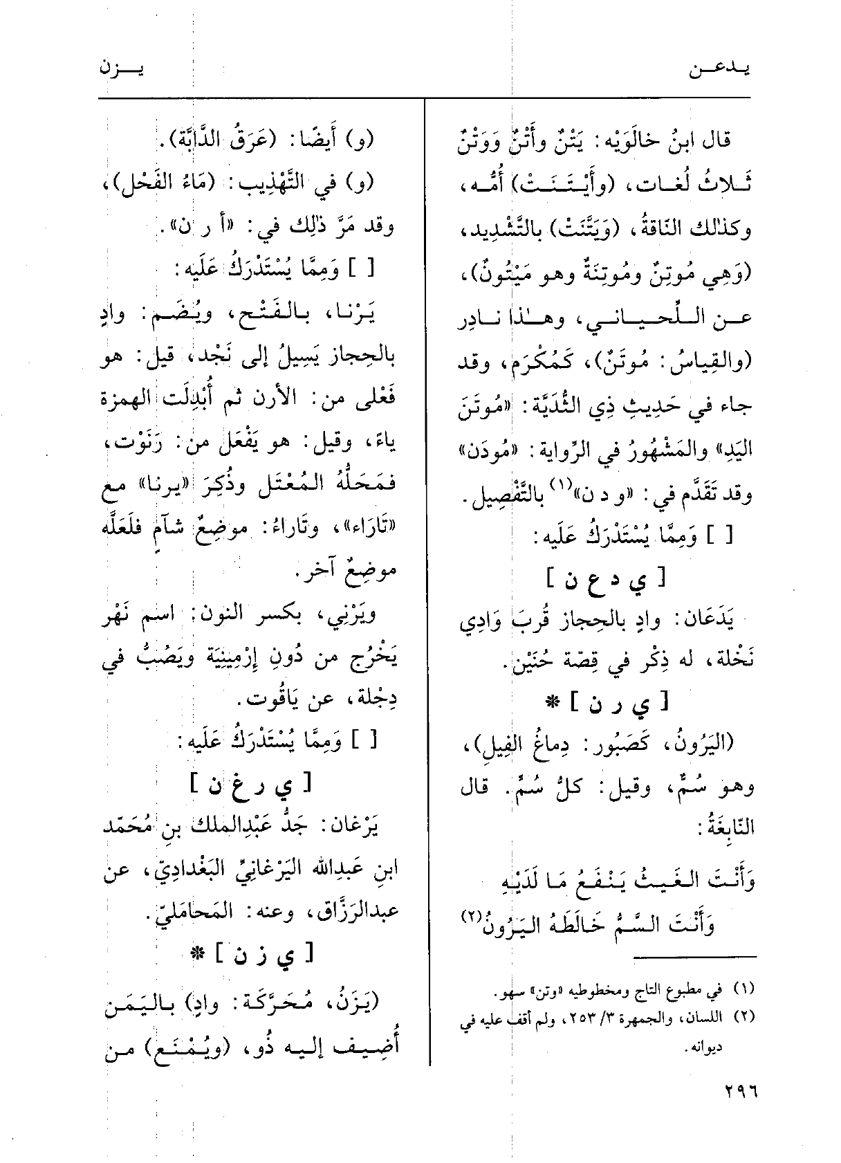: (! يَزَنُ، محرَّكةً: وادٍ) باليَمَنِ أُضِيفَ إِلَيْهِ ذُو، (ويُمْنَعُ) مِن