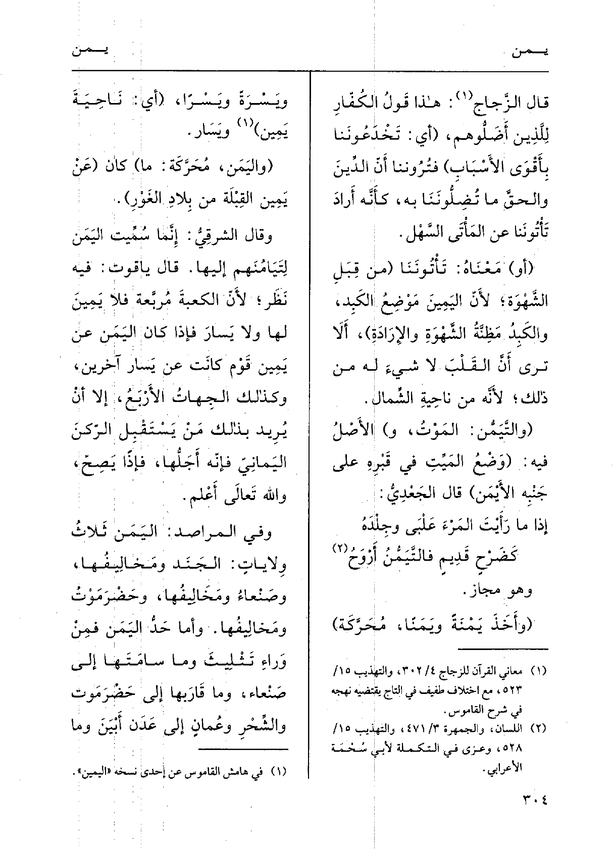 قالَ الزجَّاجُ: هَذَا قوْلُ الكفَّارِ للَّذِينَ أَضَلُّوهم؛ (أَي تَخْدَعُوننا بأَقْوَى الأَسْبابِ) فتُرُونَنا أنَّ الدِّينَ والحَقَّ مَا تُضِلُّوننا بِهِ، كأَنَّه أَرادَ تَأْتُونَنا عَن المَأْتَى السَّهْل؛ (أَو) مَعْناه: تَأْتُونَنا (من قِبَلِ الشهوةِ لأنَّ اليَمِينَ مَوْضِعُ الكَبِدِ، والكَبِدُ مَظِنَّةُ الشهوةِ والإرادَةِ) ، أَلا تَرَى أنَّ القَلْبَ لَا شَيْء لَهُ مِن ذلِكَ لأنَّه من ناحِيَةِ الشِّمالِ؟