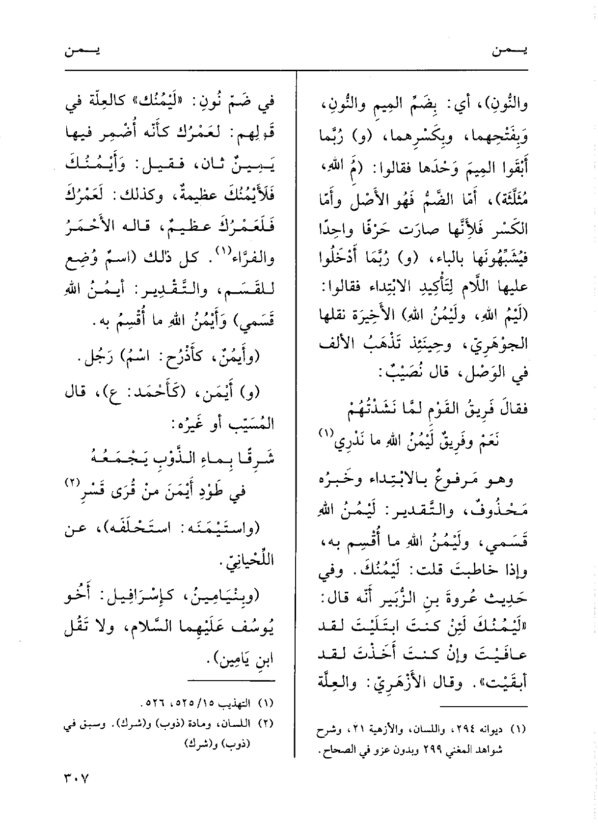 وقالَ الأَزْهرِيُّ: والعلَّةُ فِي ضمِّ نونِ لَيْمُنَك كالعَلَّةِ فِي قوْلِهم لَعَمْرُكَ، كأَنَّه أُضْمِرَ فِيهَا يَمِينٌ ثانٍ، فقيلَ: وأَيْمُنك، فلأَيْمُنك عَظِيمَة، وكَذلِكَ لَعَمْرُك، فلعمرك عَظِيمٌ، قالَهُ الأحْمَر والفرَّاء.