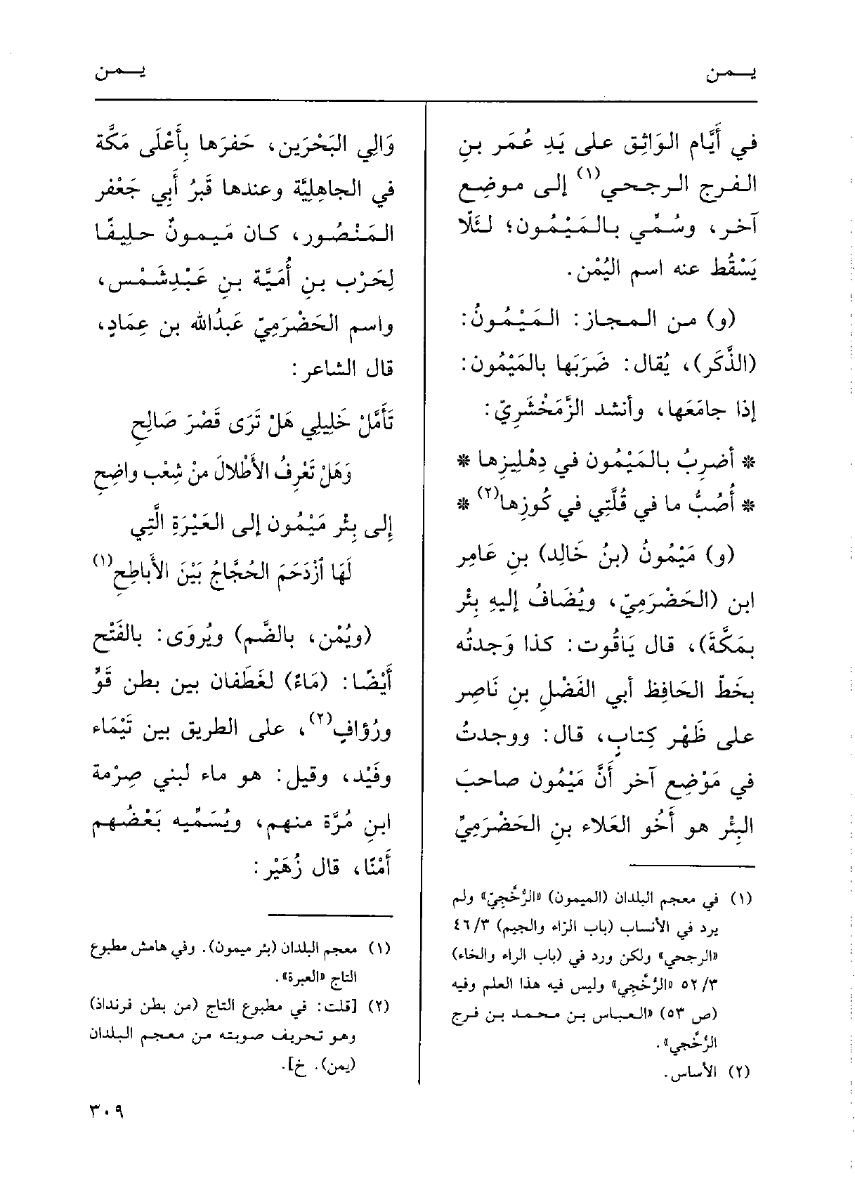 تَأمل خليلي هَل ترى قصرَ صالحوهل تعرف الأطلال من شعب وَاضح؟ إِلَى بِئْر مَيْمُون إِلَى الْعبْرَة التيلها ازدحَمَ الْحجَّاج بَين الأباطح (! ويُمْنٌ، بالضَّمِّ) ، ويُرْوَى بالفتْحِ أَيْضاً: (ماءٌ) لغَطَفانَ مِن بَطْنِ فِرِنْداذ على الطَّريقِ بينَ تَيْماءَ وفَيْد.