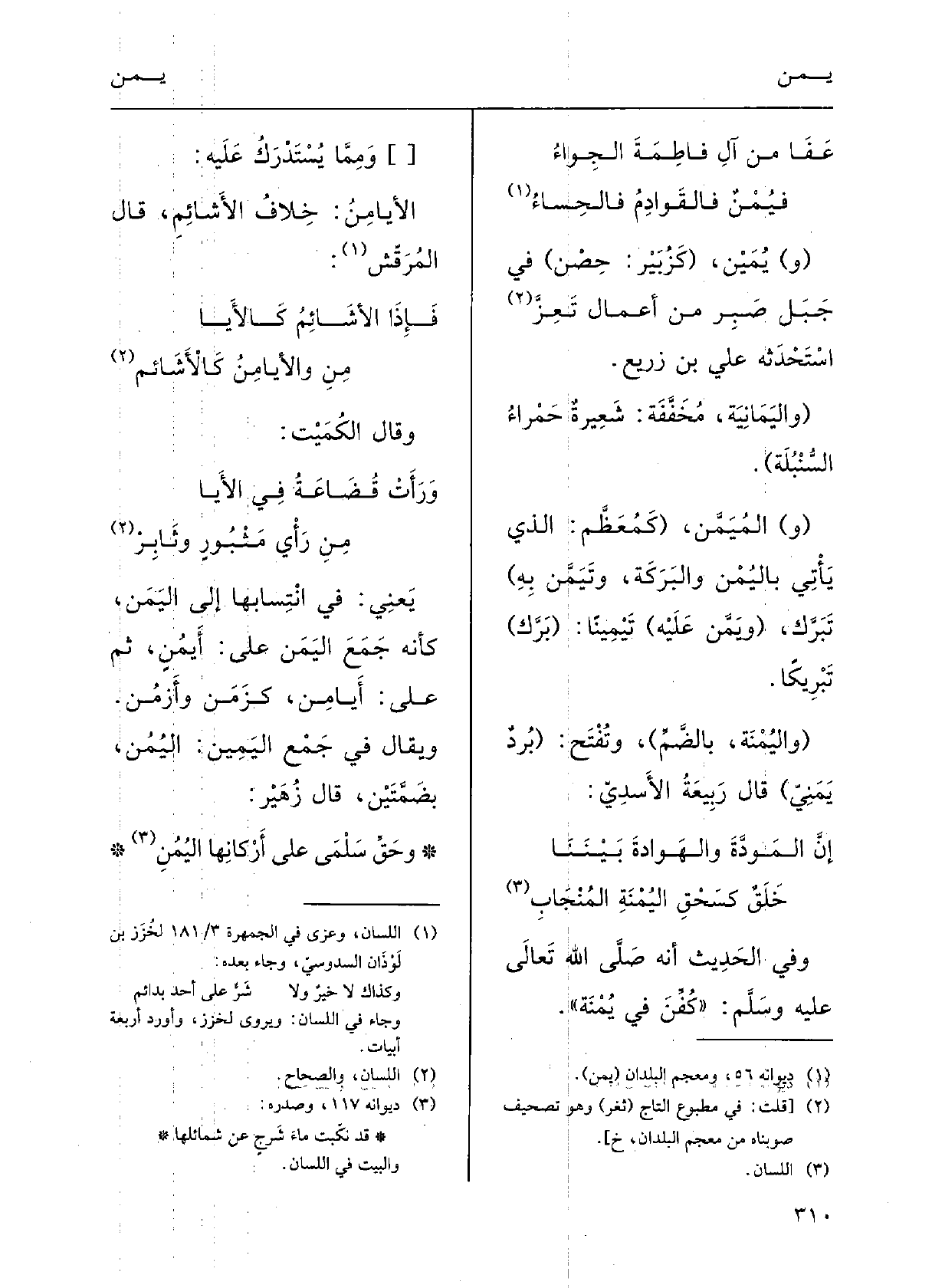 ورَأَتْ قُضاعَةُ فِي الأيامِنِ رَأْيَ مَثْبُورٍ وثابِرْيعْني فِي انْتِسابِها إِلَى اليَمَنِ، كأَنَّه جَمَع اليَمَنَ على} أَيْمُنٍ ثمَّ على! أَيامِنَ كزَمَنٍ وأَزْمُن. ويقالُ فِي جَمْعِ اليَمِينِ اليُمُنُ بضَمَّتَيْن؛ قالَ زهيرٌ: