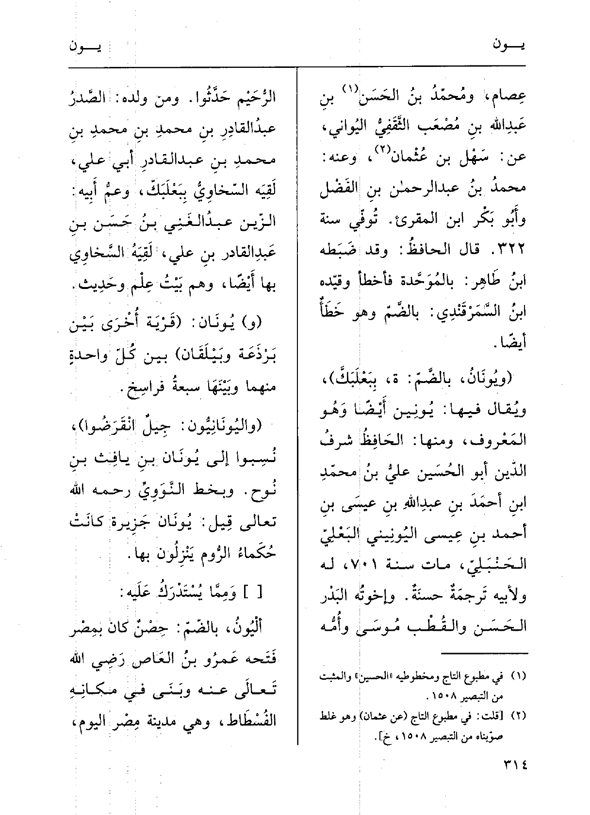 (} ويونانُ، بالضَّمِّ: ة ببَعْلَبَكَّ) .) ويقالُ فِيهَا {يونينُ أَيْضاً، وَهُوَ المَعْروفُ، وَمِنْهَا الحافِظُ شَرَفُ الدِّين أَبو الحُسَيْن عليُّ بنُ محمدِ بنِ أَحمدَ بنِ عبدِ اللَّهِ بنِ عيسَى بنِ أَحمدَ بنِ عيسَى} اليُونِيني البَعْليّ الحَنْبليُّ ماتَ سَنَة 701، لَهُ ولأبِيهِ تَرْجمةٌ حَسَنةٌ، وإخوتُه البَدْرُ الحَسَنُ والقطبُ موسَى وَأمة الرَّحِيم، حَدَّثوا، ومِن ولدِه: الصَّدْرُ عبدُ القادرِ بنُ محمدِ بنِ محمدِ بنِ محمدِ بنِ عبدِ القادِرِ أَبي عليَ، لقِيَه السّخاوي ببَعْلَبَكَّ؛ وعَمّ أَبيه الزَّيْن عبدُ الغَنِي بنُ حَسَنِ بنِ عبدِ القادِرِ بنِ عليَ لَقِيَه السَّخاوِي بهَا أَيْضاً، وهُم بيتُ عِلْمٍ وحدِيثٍ.