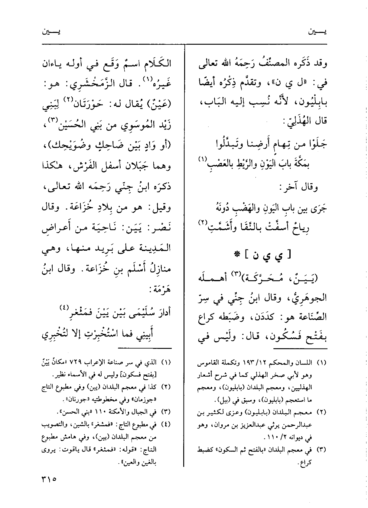 وقالَ نَصْر: يَيَنُ: ناحِيَةٌ مِن أَعْراضِ المَدينَةِ على بريدٍ مِنْهَا، وَهِي منازِلُ أَسْلَم بن خزاعَةَ؛ وقالَ ابنُ هرمة: