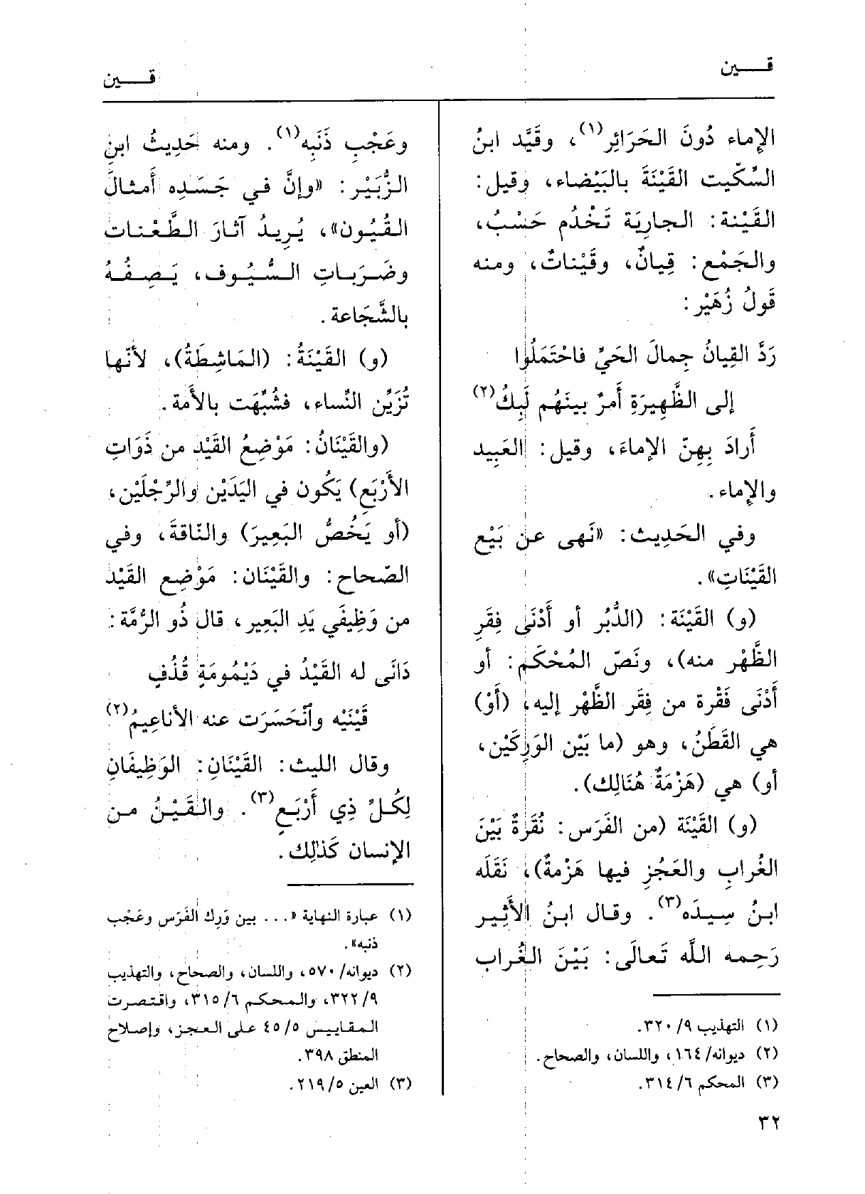دانى لَهُ القَيْدُ فِي دَيمومةٍ قُذُفٍ} قَيْنَيْه وانْحَسَرتْ عَنهُ الأَناعِيمُوقالَ اللَّيْثُ: {القَيْنان الوَظِيفَان لكلِّ ذِي أَرْبَعٍ،} والقَيْنُ مِن الإِنْسانِ كذلكَ.