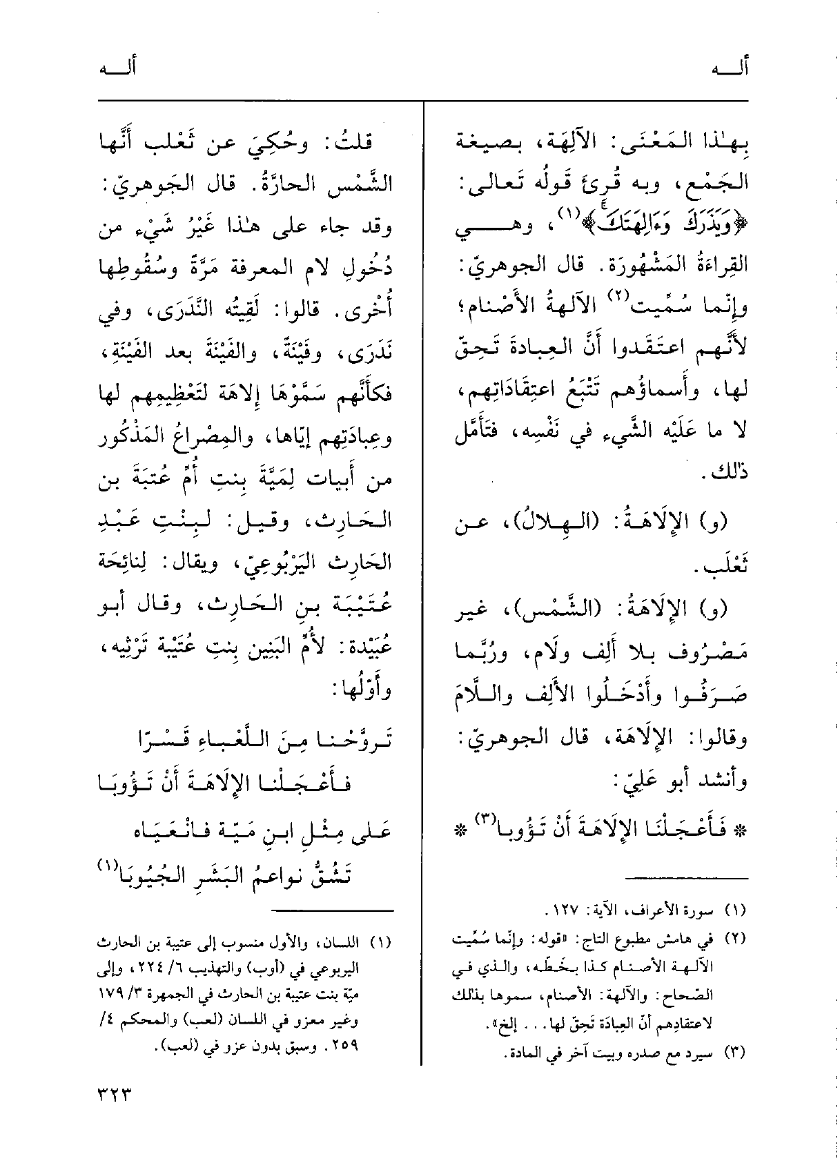 بِهَذَا المعْنَى الآلِهَةُ بصيغَةِ الجَمْعِ، وَبِه قُرِىءَ قَوْلُه تعالَى: {ويَذَرَكَ {وآلِهَتَكَ} ، وَهِي القِراءَةُ المَشْهورَةُ.
