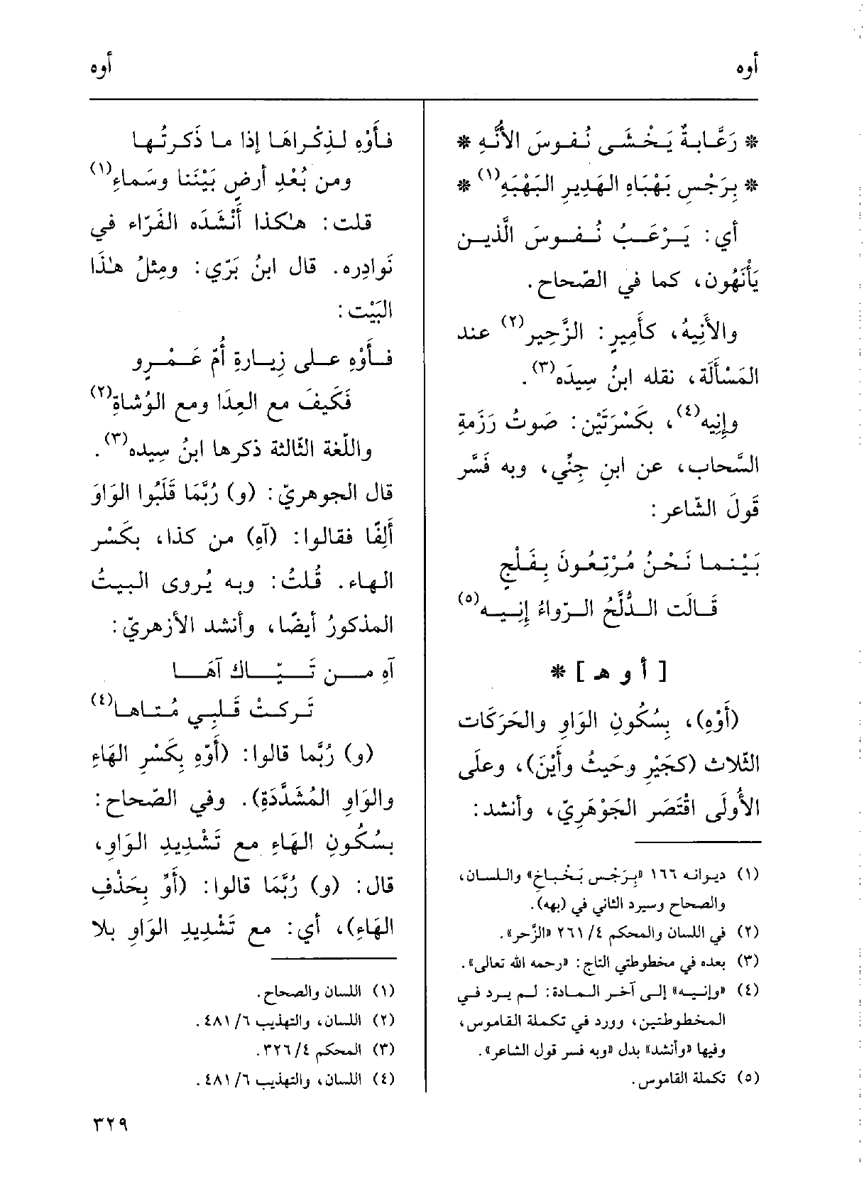 فأَوْهِ على زِيارَةِ أُمِّ عَمْرٍ وفكيفَ مَعَ العِدَا ومعَ الوُشاةِ؟ والُّلغةُ الثَّالثةُ ذَكَرَها ابنُ سِيدَه.