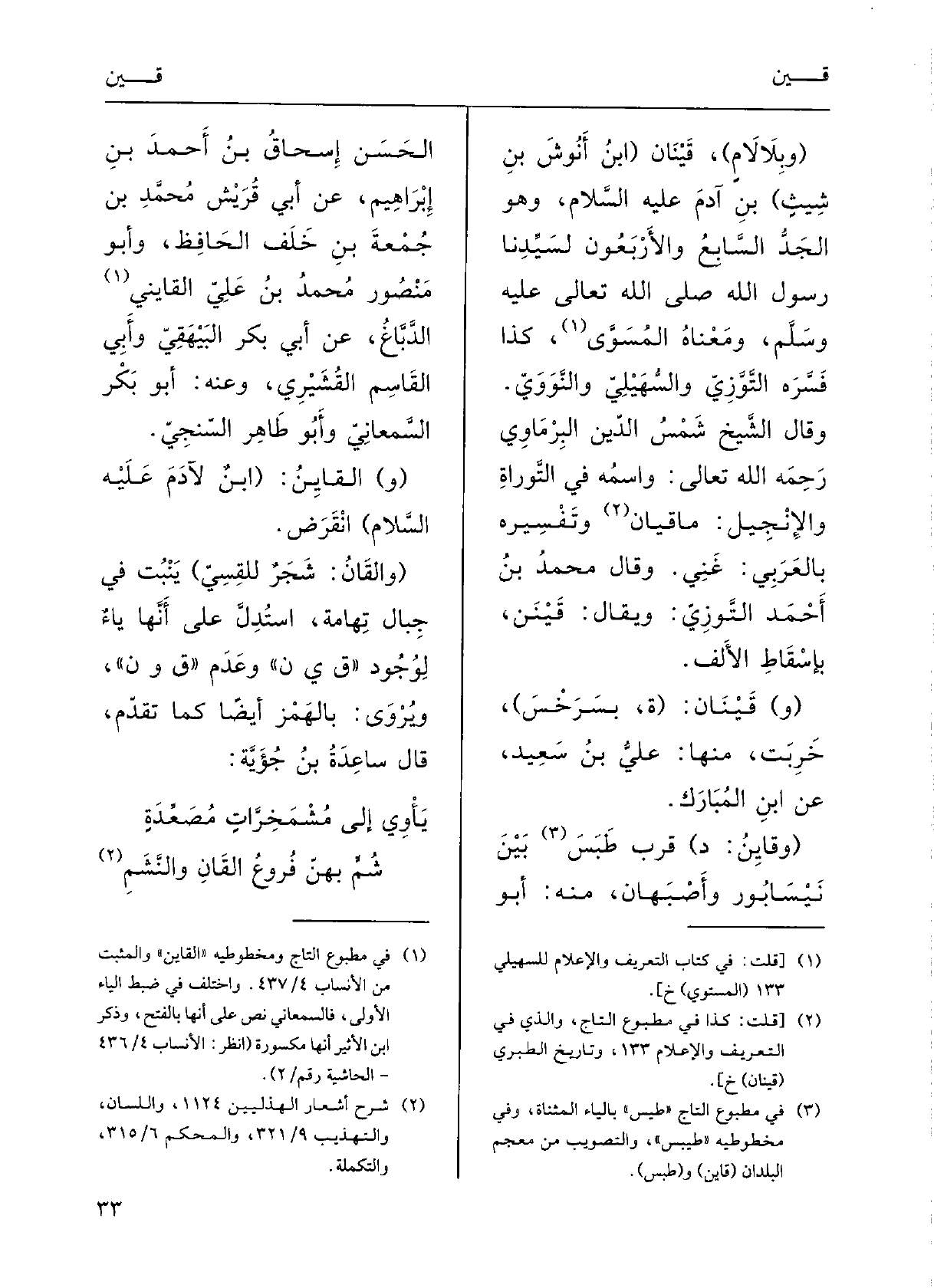 (وبِلا لامٍ، {قَيْنانُ (بنُ أَنُوشَ بنِ شِيثِ بنِ آدَمَ، عَلَيْهِ السَّلام، وَهُوَ الجَدُّ السابِعُ والأَرْبَعُون لسيِّدِنا رَسُولِ اللهِ، صلى الله عَلَيْهِ وَسلم ومَعْناهُ المُسَوِّي، كَذَا فَسَّرَه التّوَزِيُّ والسّهيليّ والنّوويّ.