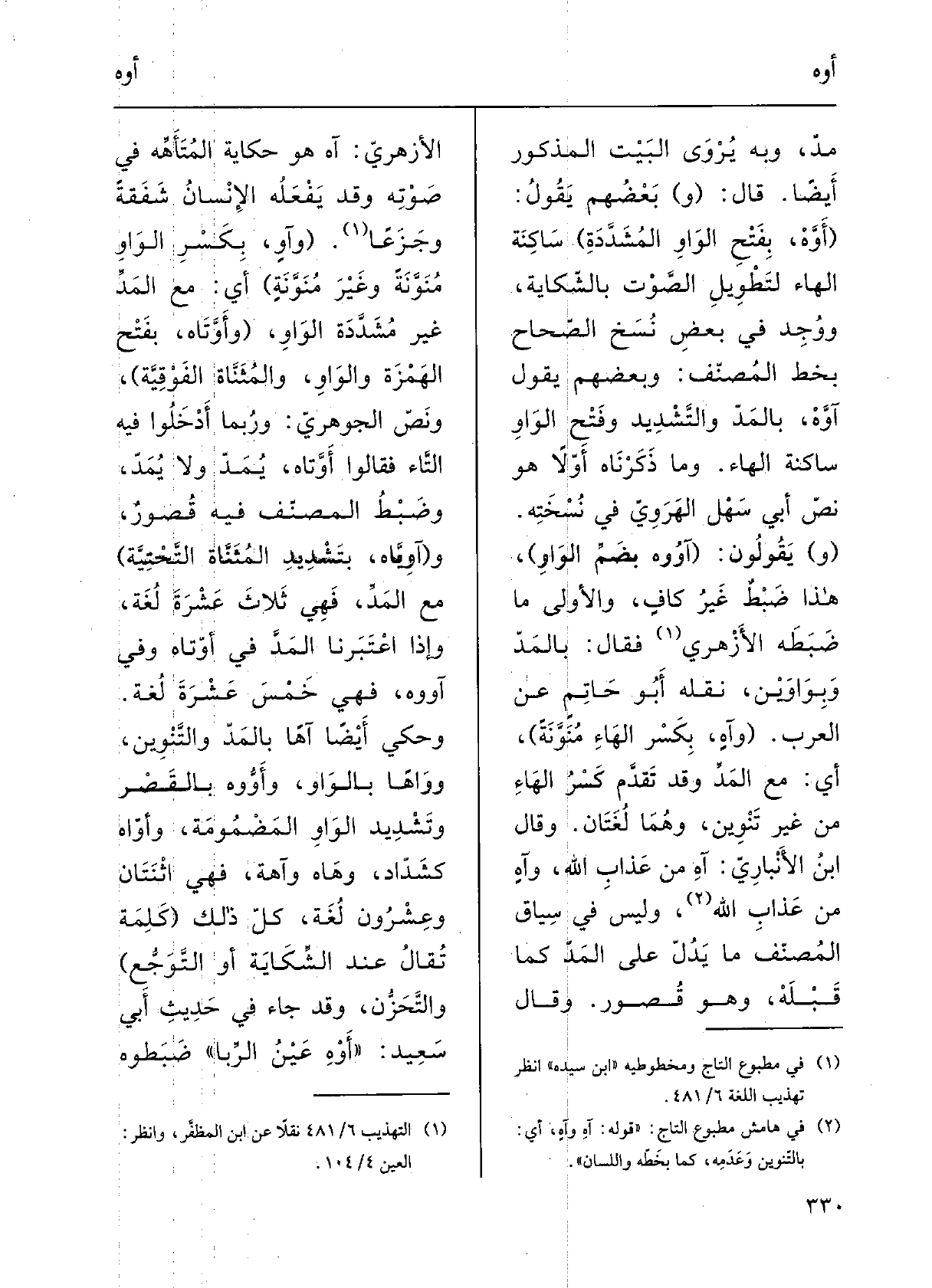 وحُكِيَ أَيْضاً: آهاً بالمدِّ والتَّنْوينِ، وواهاً بالواوِ،} وأَوُّوه بالقَصْرِ وتَشْديدِ الواوِ المَضْمومَةِ، وأَوَّاه كشَدَّادٍ، وهاه وآهَة، فهنَّ اثْنَتان وعِشْرُون لُغَة؛ كلُّ ذلِكَ (كلمَةٌ تقالُ عِنْد الشِّكايَةِ أَو التَّوَجُّعِ) والتَّحَزُّنِ؛ وَقد جاءَ فِي حدِيثِ أَبي سعِيدٍ: (! أَوْهِ عَيْنُ الرِّبا) ، ضَبَطُوه