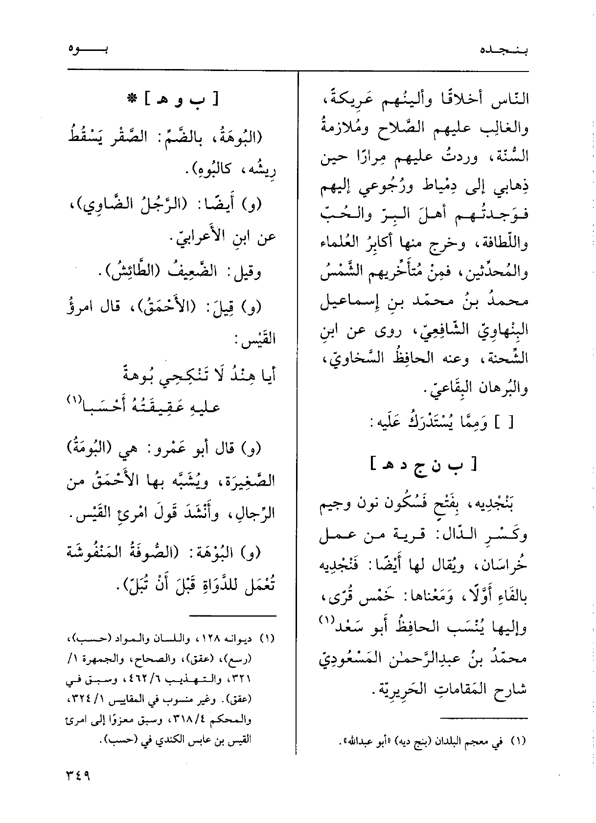 أيا هِنْدُ لَا تَنْكحِي! بُوهةً عَلَيْهِ عَقيقتُه أَحْسَبا (و) قالَ أَبو عَمْرٍ و: هِيَ (البُومَةُ) الصَّغيرَةُ، ويُشَبَّه بهَا الأَحْمقُ مِن الرِّجالِ؛ وأَنْشَدَ قَوْل امْرِىءِ القَيْسِ.
