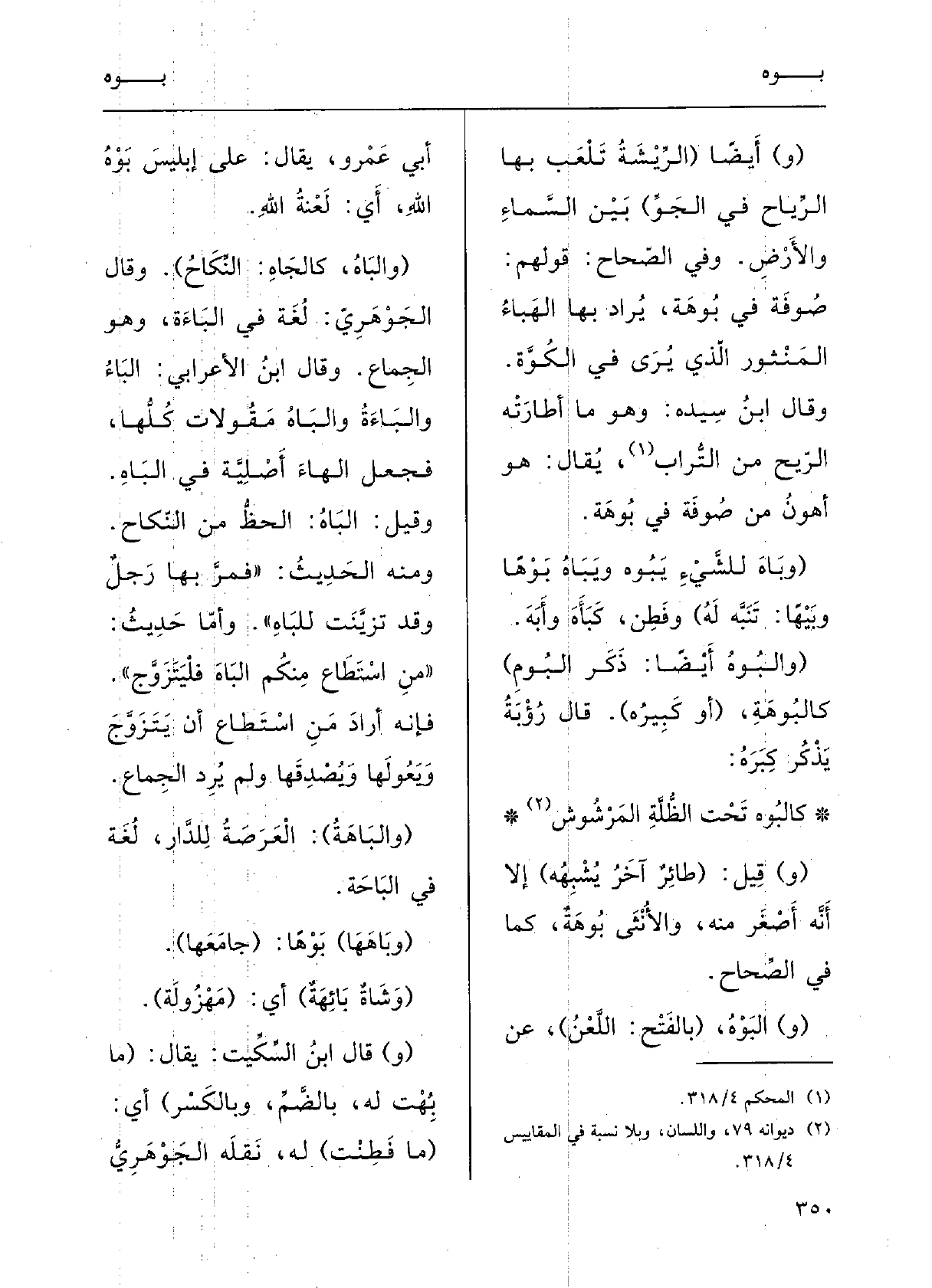 (} وباهَ للشَّيءِ {يَبوهُ} ويَباهُ {بَوْهاً وبَيْهاً: تَنَبَّه لَهُ) وفطنَ كبَأَه وأَبه (} والبُوهُ أَيْضاً: ذَكَرُ البُومِ) ، {كالبُوهَةِ، (أَو كبيرُه) ؛) قالَ رُؤْبَة يَذْكُرُ كِبَره: