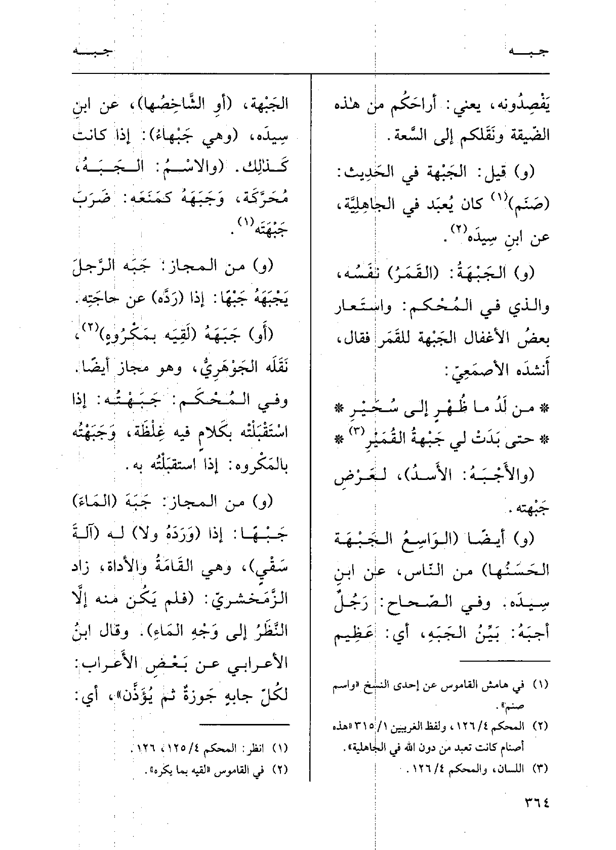 (و) قيلَ: الجَبْهَةُ فِي الحدِيثِ (صَنَمٌ) كانَ يُعْبَدُ فِي الجاهِلِيَّةِ؛ عَن ابنِ سِيدَه.