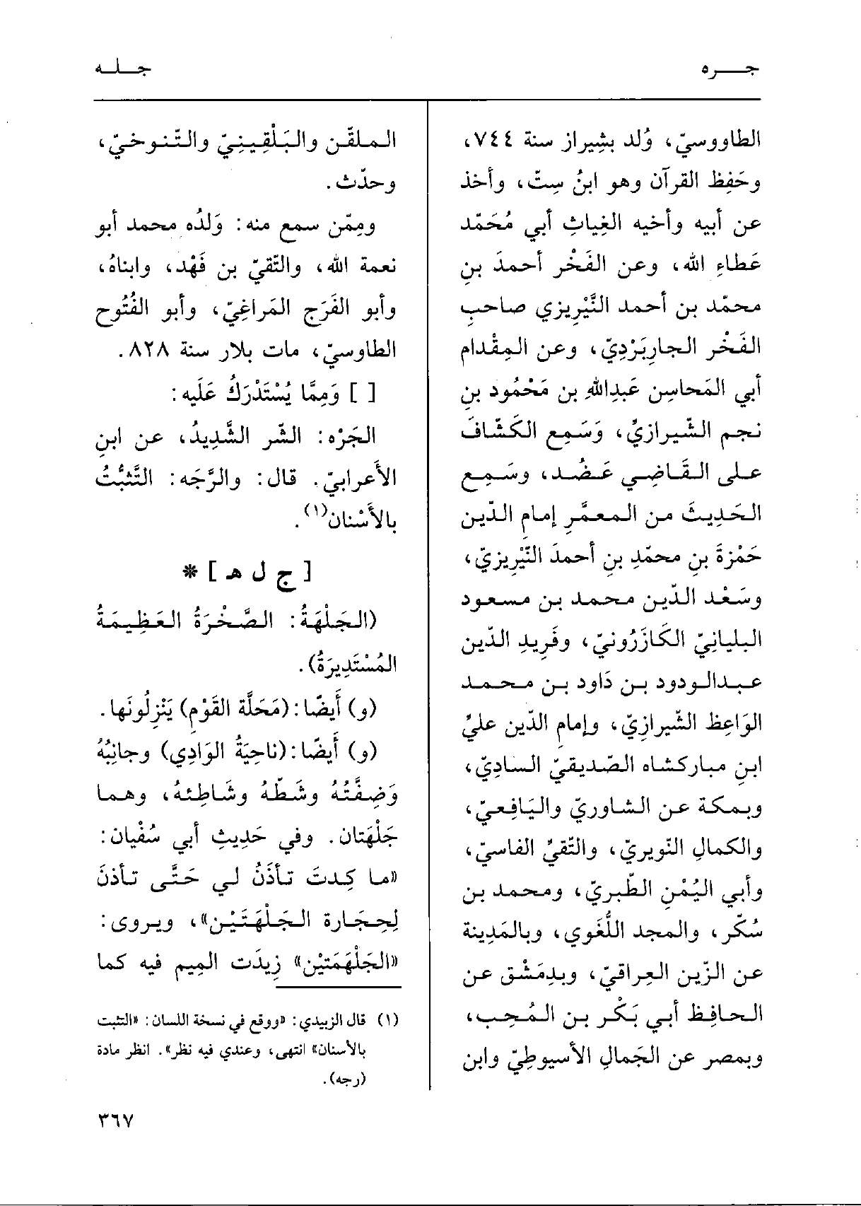 الجَرْهُ: الشَّرُّ الشَّديدُ؛ عَن ابنِ الأَعْرابيِّ؛ قالَ: والرَّجَهُ التَّثَبُّتُ بالأسْنانِ.