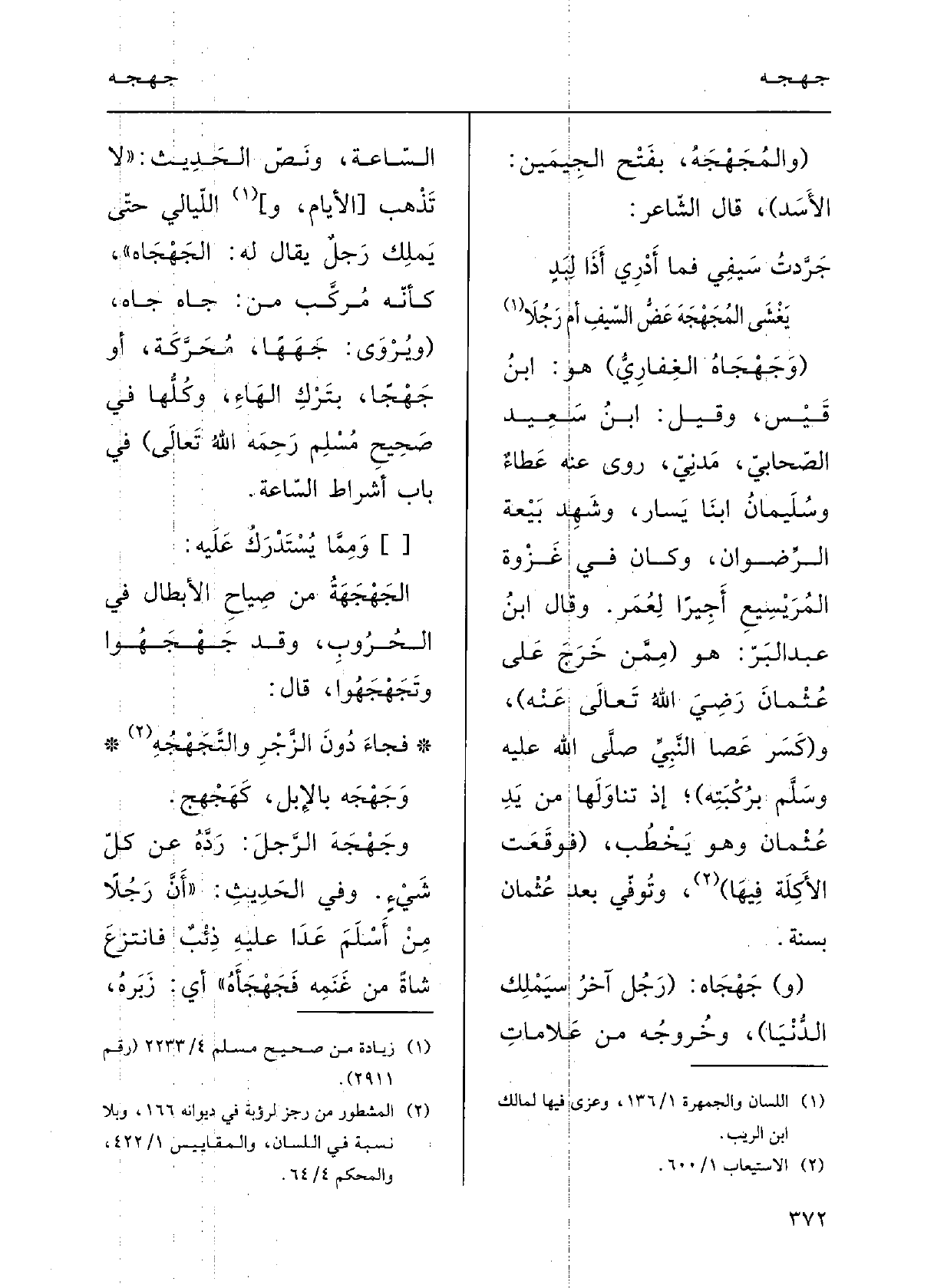 جَرَّدْتُ سَيْفِي فَمَا أَدْرِي إِذا لِبَدٍ يَغْشَى} المُجَهْجَهَ عَضُّ السَّيْف أَم رَجُلا ( {وجَهْجَاه الغِفارِيُّ) :) هُوَ ابنُ قَيْسٍ، وقيلَ: ابنُ سعِيدٍ، صَحابيٌّ، مَدنيٌّ، رَوَى عَنهُ عطاءُ وسُلَيْمانُ ابْنا يَسارٍ، وشَهِدَ بيعَةَ الرّضْوان، وكانَ فِي غزْوَةِ المُرَيْسِيع أَجيراً لعُمَر. وقالَ ابنُ عبدِ البرِّ: هُوَ (ممَّنْ خَرَجَ على عُثْمانَ، رضِيَ اللَّهُ تَعَالَى عَنهُ) ، و (كَسَرَ عَصا النبيِّ صلى الله عَلَيْهِ وَسلم برُكْبَتِه) إِذْ تَناوَلَها مِن يدِ عُثْمان وَهُوَ يَخْطبُ (فوَقَعَتِ الأَكَلِةُ فِيهَا) ، وتُوفي بَعْد عُثْمان بسَنَةٍ.