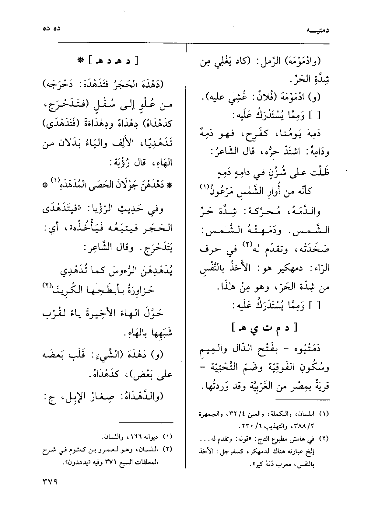 ظَلَّتْ على شُزُنٍ فِي دَامِهٍ دَمِهٍ كأَنَّه من أُوارِ الشمسِ مَرْعُونُوالدَّمَهُ، محرّكةً: شِدَّةُ حَرِّ الشمسِ.
