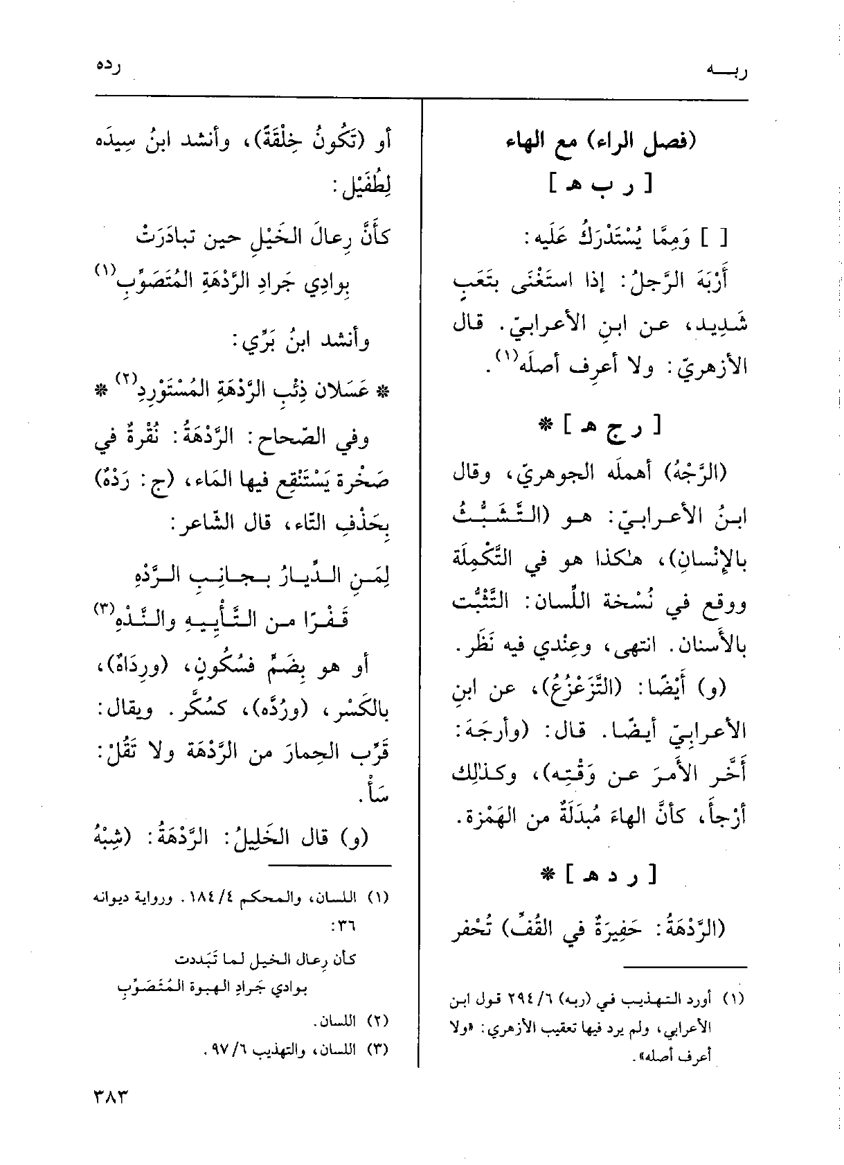 : (الرَّدْهَةُ: حَفيرَةٌ فِي القُفِّ) تُحْفَرُ أَو (تكونُ خِلْقَةً) ؛) وأَنْشَدَ ابنُ سِيدَه لطُفَيْلٍ: