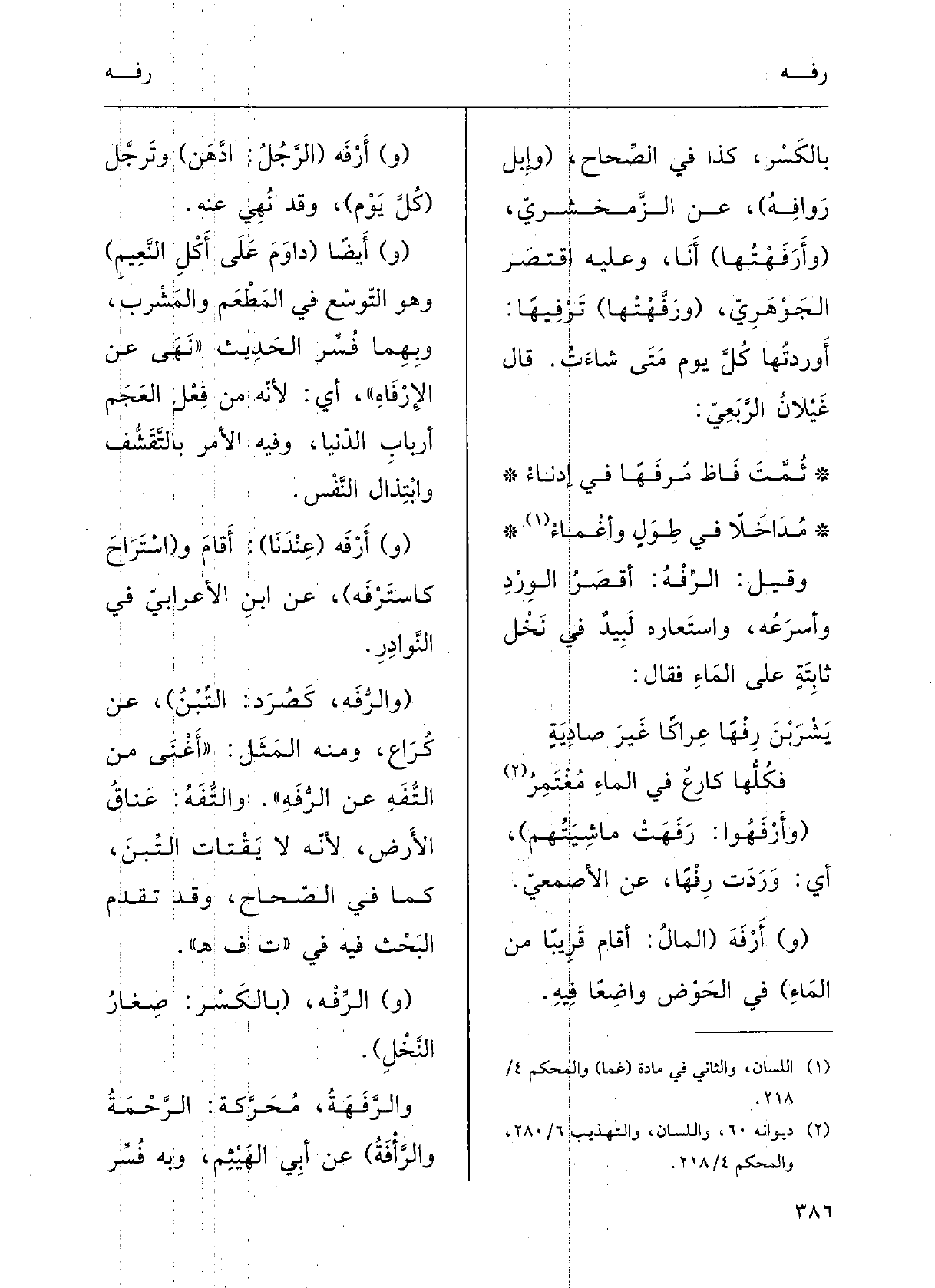 ثُمَّتَ فاظَ مُرْفَهاً فِي إدْناءْمُدَاخَلاً فِي طِوَلٍ وإغْماءْوقيلَ: الرِّفْهُ أَقْصَرُ الوِرْدِ وأَسْرَعُه؛ واسْتَعارَه لَبيدٌ فِي نخْلٍ نابِتَةٍ على الماءِ، فقالَ:
