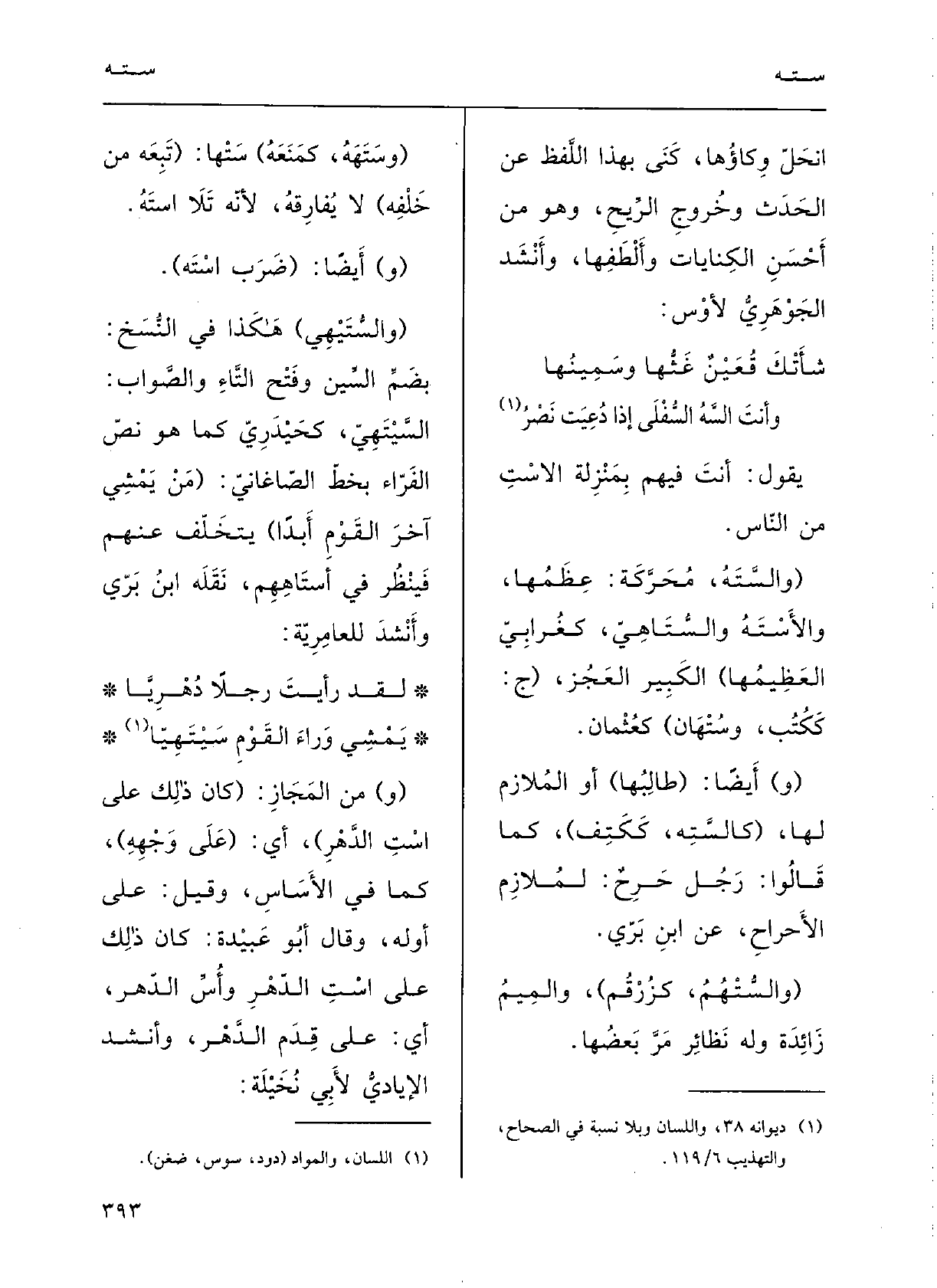 (والسُّتَيْهِيُّ) ؛) هَكَذَا فِي النسخِ بضمِّ السِّيْن وفتْحِ التاءِ والصَّوابُ السَّيْتَهِيُّ كحَيْدَريَ، كَمَا هُوَ نَصُّ الفرَّاءِ بخطِّ الصَّاغاني؛ (مَنْ يَمْشِي آخِرَ القَوْمِ أبدا) يَتخلَّفُ عَنْهُم فيَنْظُر فِي أَسْتاهِهِم؛ نَقَلَهُ ابنُ بَرِّي؛ وأَنْشَدَ للعامِرِيَّة: