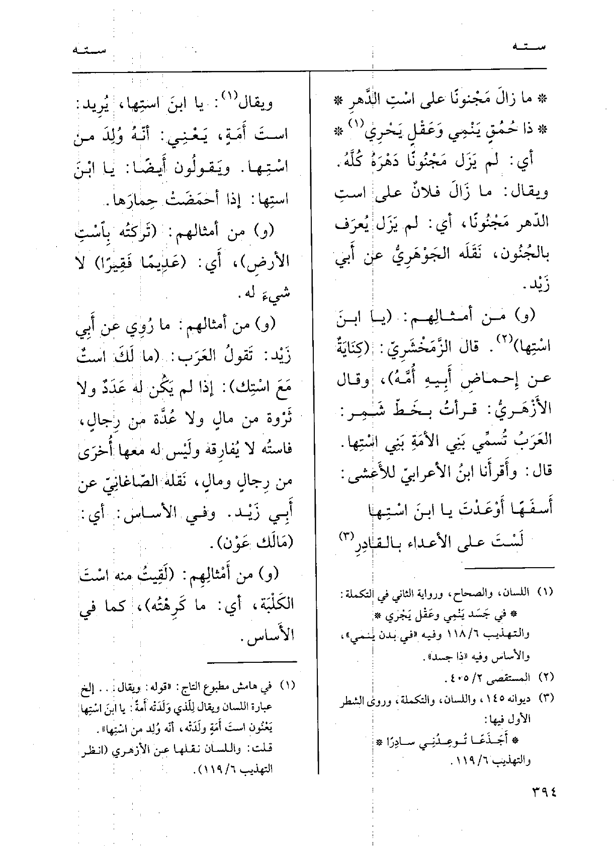 (وقالَ الأَزْهرِيُّ: قرأْتُ بخطِّ شَمِرٍ: العَرَبُ تسمِّي بَني الأَمَةِ بَني اسْتِها؛ قالَ وأَقْرَأَنا ابنُ الأعْرابيِّ للأَعْشى: