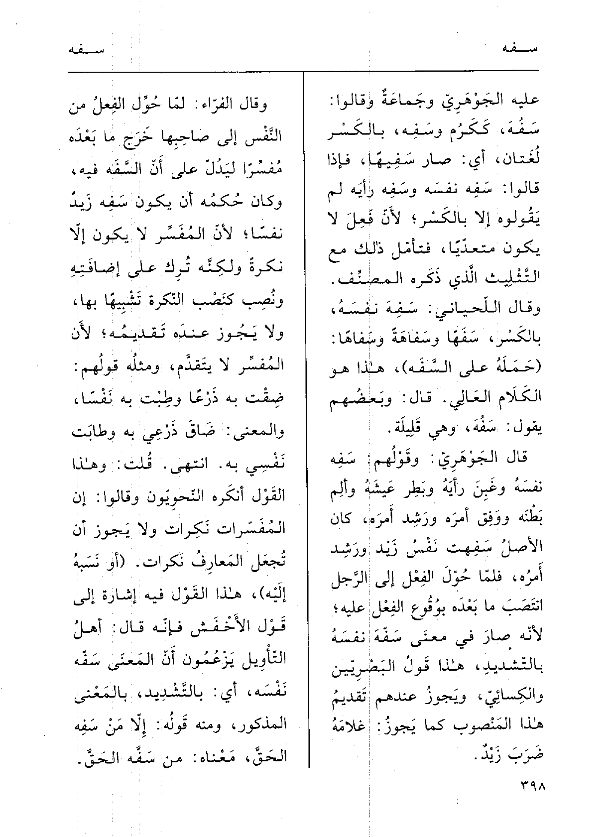 قالَ الجوْهرِيُّ: وقوْلُهم: سَفِهَ نَفْسَه وغَبِنَ رأْيَه وبَطِرَ عَيْشَه وأَلِمَ بَطْنَه ووَفِقَ أَمْرَه ورَشِدَ أَمْرَه، كانَ الأصْلُ سَفِهَتْ نَفْسُ زيْدٍ، ورَشِدَ أَمْرُه، فلمّا حُوِّلَ الفِعْل إِلَى الرَّجلِ انْتَصَبَ مَا بَعْدَه بوقُوعِ الفِعْلِ عَلَيْهِ، لأنَّه صارَ فِي معْنَى سَفَّهَ نَفْسَه، بالتّشْديدِ؛ هَذَا قَوْلُ البَصْرِيّين والكِسائي، ويَجوزُ عنْدَهم تَقْديمُ هَذَا المَنْصوب كَمَا يَجوزُ غلامَه ضَرَبَ زيْدٌ.