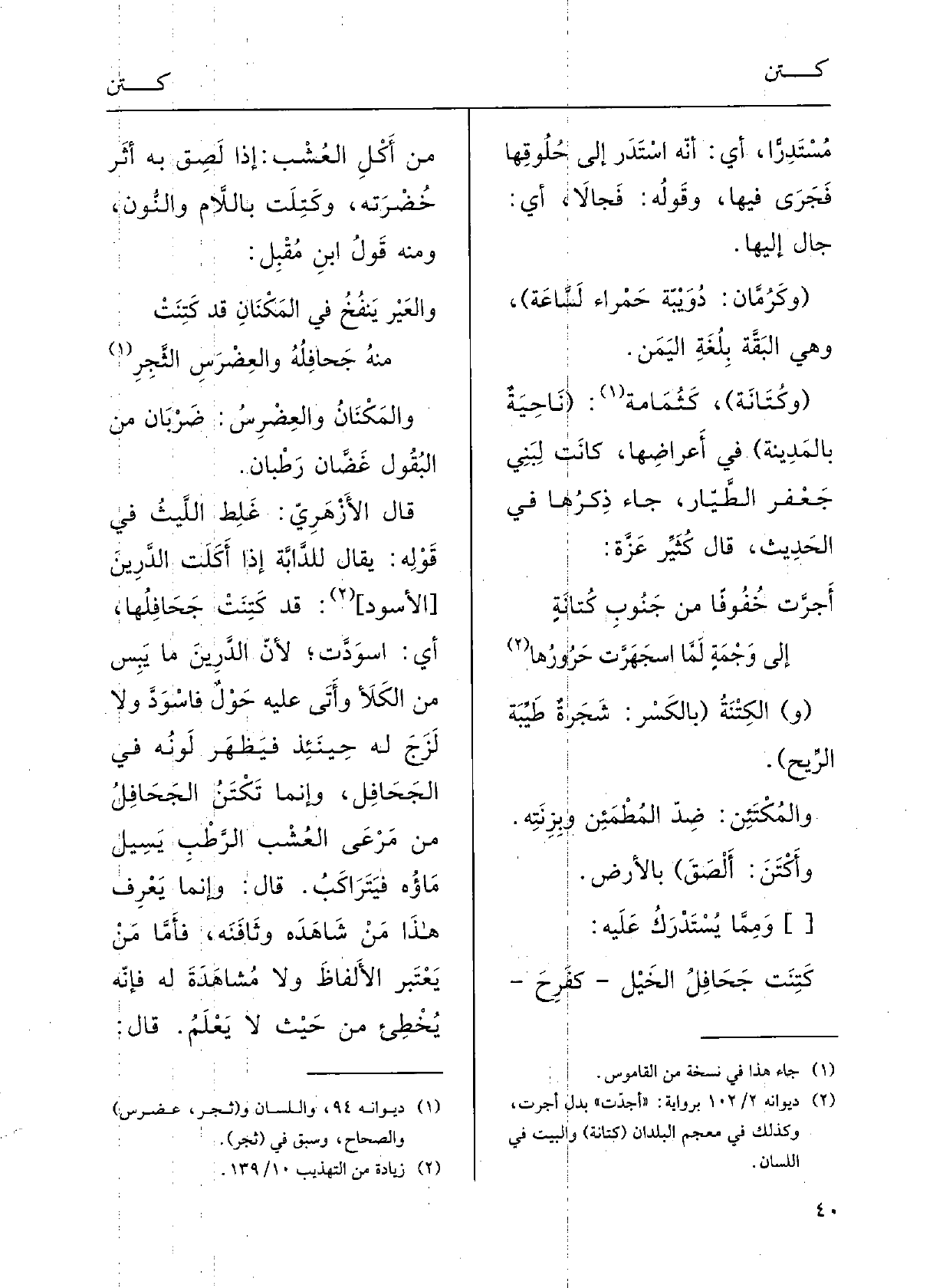 والعَيْرُ يَنْفُخُ فِي المَكْنانِ قد كَتِنَتْمنه جَحافِلُه والعَضْرَسِ الثُّجَرِوالمَكْنانُ والعِضْرِسُ: ضَرْبانِ من البقُولِ غَضَّان رَطْبانِ.