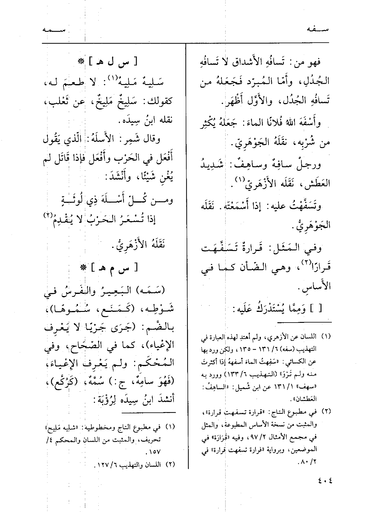 :) سَلِيهٌ مَلِيح لاطَعْمَ لَهُ، كقَوْلكَ: سَلِيخٌ مَلِيخٌ؛ عَن ثَعْلَب؛ نَقَلَهُ ابنُ سِيدَه.