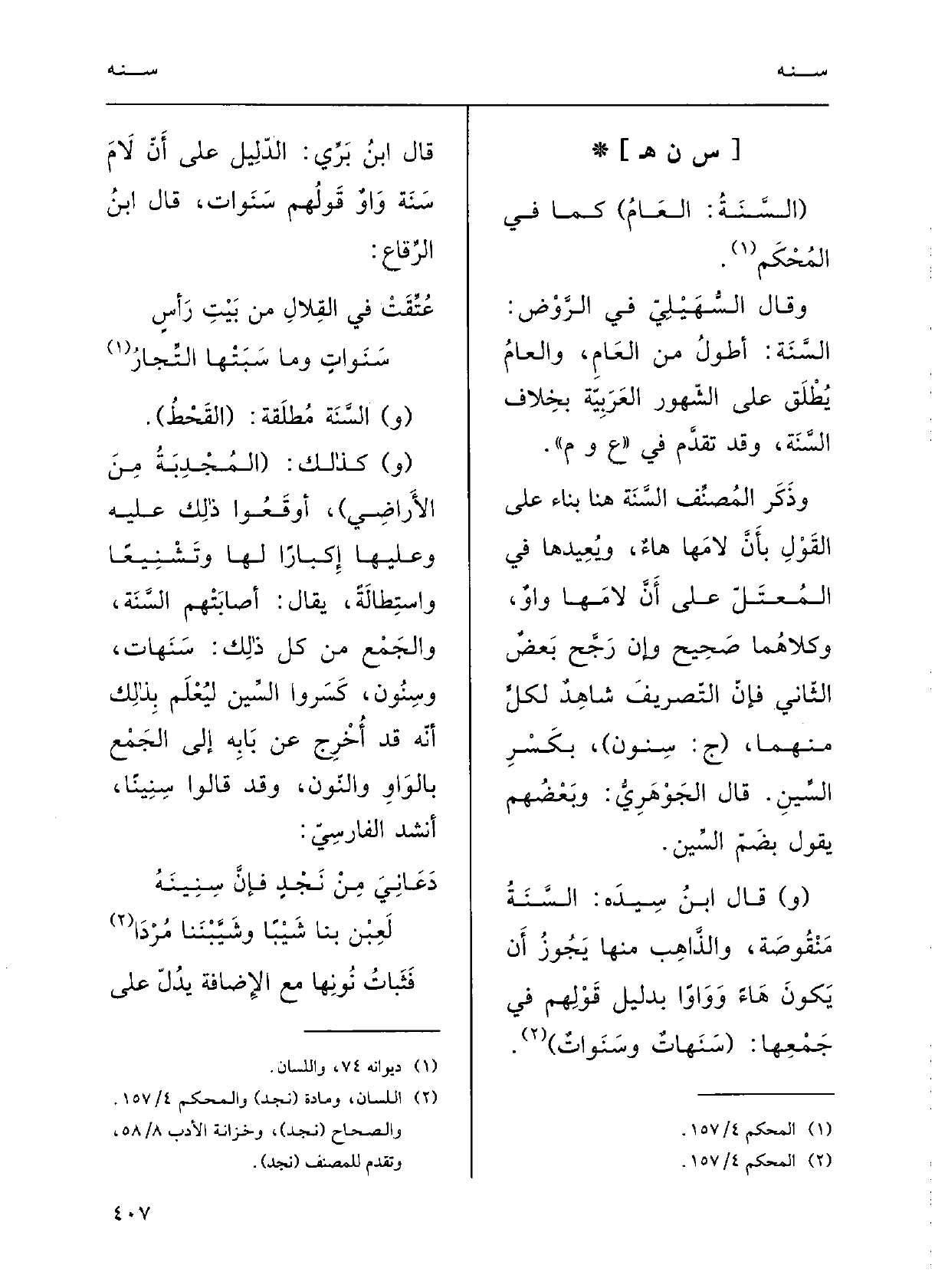 وذَكَرَ المصنِّفُ السَّنَةَ هُنَا بِنَاء على القَوْلِ بأَنَّ لامَها هاءٌ ويعيدُها فِي المعْتلِّ على أَنَّ لامَها واوٌ، وكِلاهُما صَحِيحٌ وَإِن رَجَّح بعضٌ الثَّانِي، فإنَّ التَّصْريفَ شاهِدٌ لكلَ مِنْهُمَا.