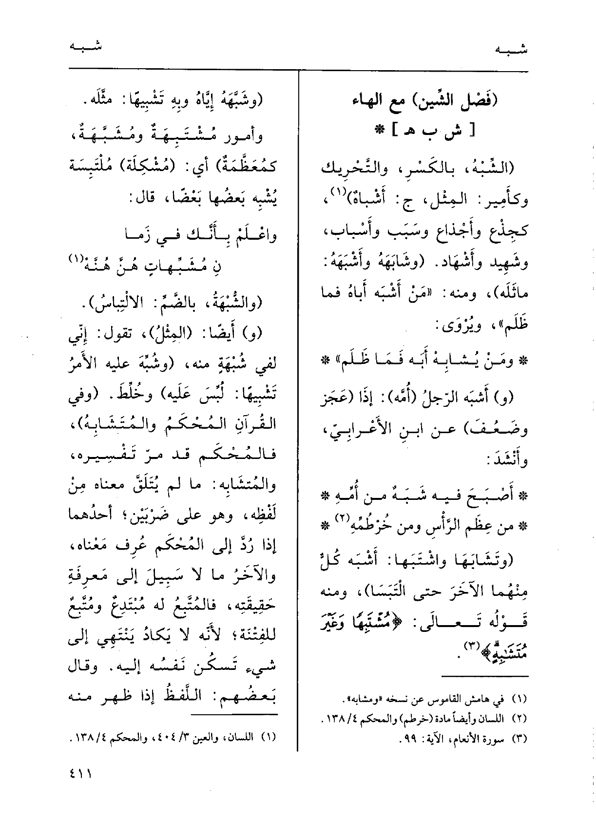 واعْلَمْ بأنَّكَ فِي زَمانِ مُشَبِّهاتٍ هُنَّ هُنَّهْ (والشُّبْهَةُ، بالضَّمِّ: الالْتِباسُ؛ و) أَيْضاً: (المِثْلُ) .) تقولُ: إنِّي لفِي شُبْهَةٍ مِنْهُ.