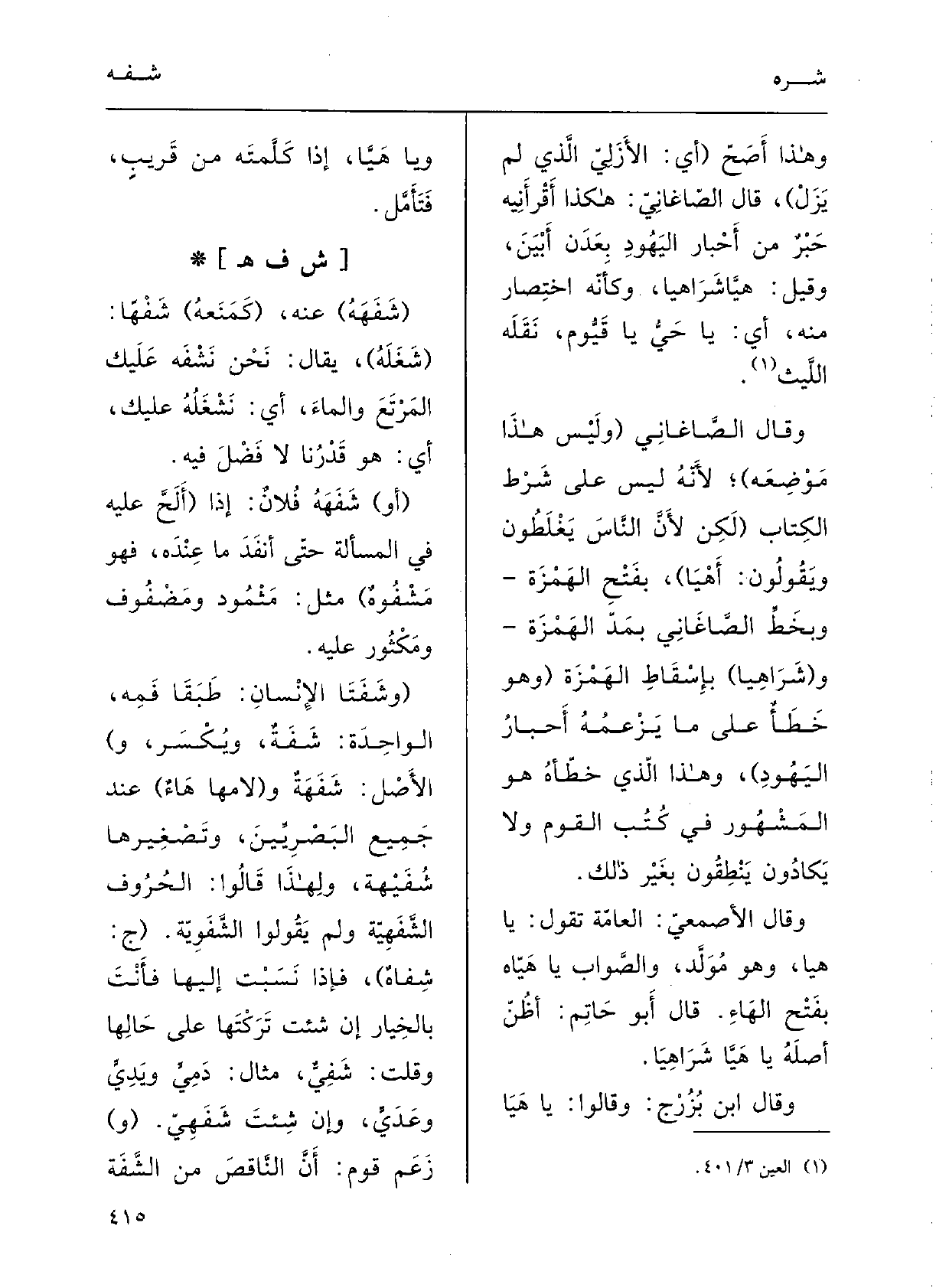 وقالَ الصَّاغانيُّ: (وليسَ هَذَا مَوْضِعَهُ) لأنَّه ليسَ على شَرْطِ الكِتابِ، (لَكِن لأنَّ النِّاسَ يَغْلَطونَ ويقولونَ أَهْيَا) ، بفتْحِ الهَمْزةِ، وبخطِّ الصَّاغانيّ: بمدِّ الهَمْزةِ، و (شَراهِيا) ، بإسْقاطِ الهَمْزةِ، (وَهُوَ خَطَأٌ على مَا يَزْعُمُهُ أَحْبارُ اليَهودِ) .) وَهَذَا الَّذِي خَطَّأَه هُوَ المَشْهورُ فِي كُتُبِ القوْمِ، وَلَا يكادُونَ يَنْطقُونَ بغيرِ ذلكَ.