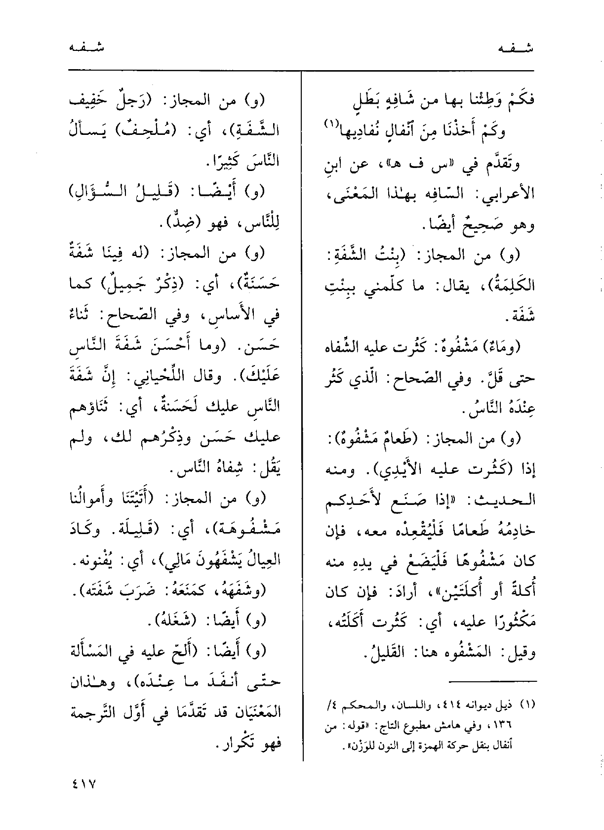 (و) مِن المجازِ: (طَعامٌ مَشْفُوهٌ) ، إِذا (كثُرَت عَلَيْهِ الأَيْدِي) ، وَمِنْه الحدِيثُ: (إِذا صَنَع لأَحدِكُم خادِمُه طَعاماً فليُقْعِده مَعَه، فَإِن كانَ مَشْفُوهاً فليَضَعْ فِي يدِه مِنْهُ أُكْلةً أَو أُكْلَتَيْنِ) ؛ أَرادَ فَإِن كانَ مَكْثوراً عَلَيْهِ أَي كثُرَت أَكَلَتُه، وقيلَ: المَشْفُوهُ هُنَا القَلِيلُ.