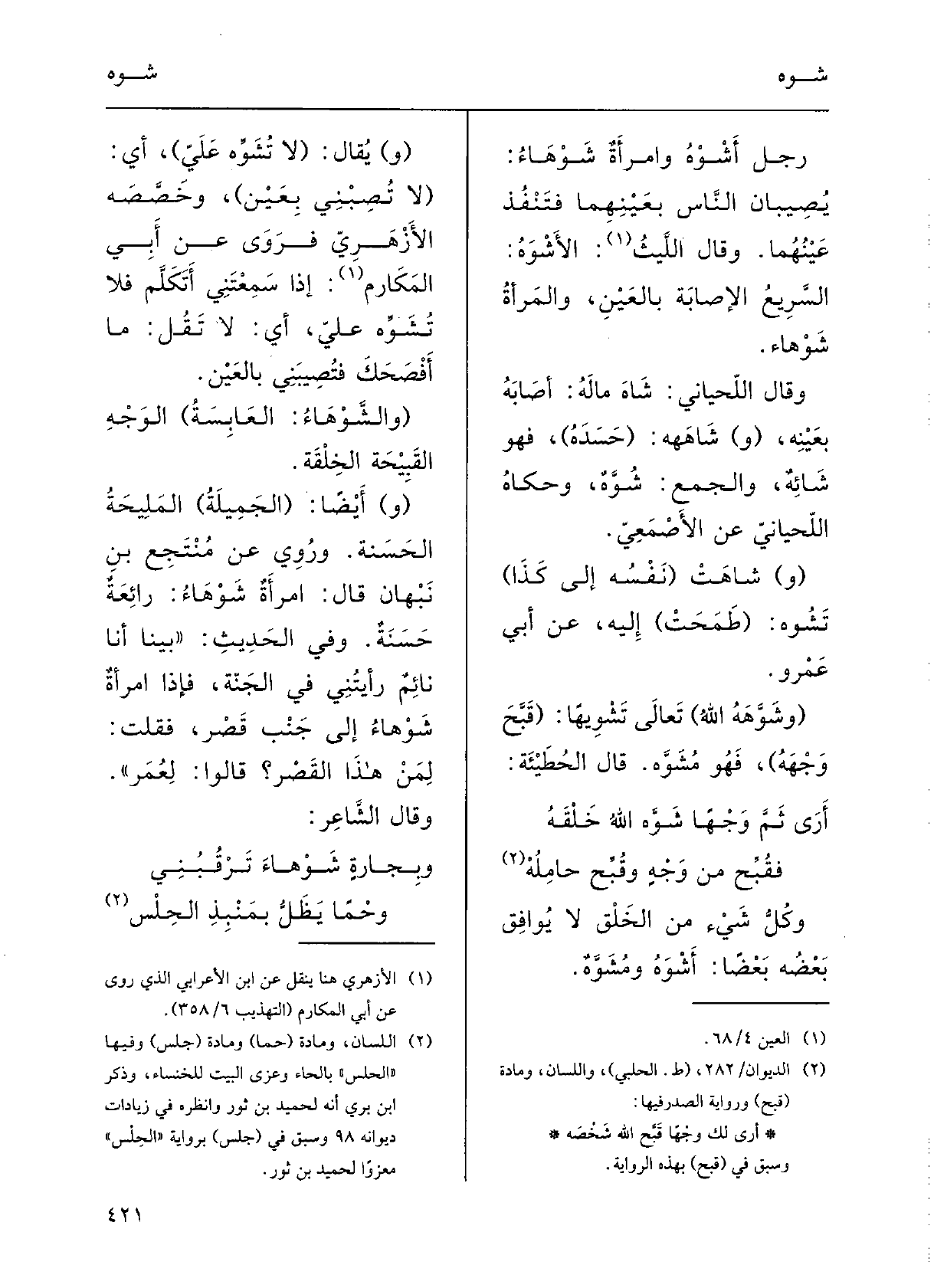 أَرى ثَمَّ وَجْهاً} شَوَّهَ اللَّهُ خَلْقَه فقُبِّحَ مِنْ وَجْهٍ وقُبِّحَ حامِلُهْوكلُّ شيءٍ من الخَلْقِ لَا يُوافِقُ بعضُه بَعْضًا: {أَشْوَهُ} ومُشَوَّهٌ.