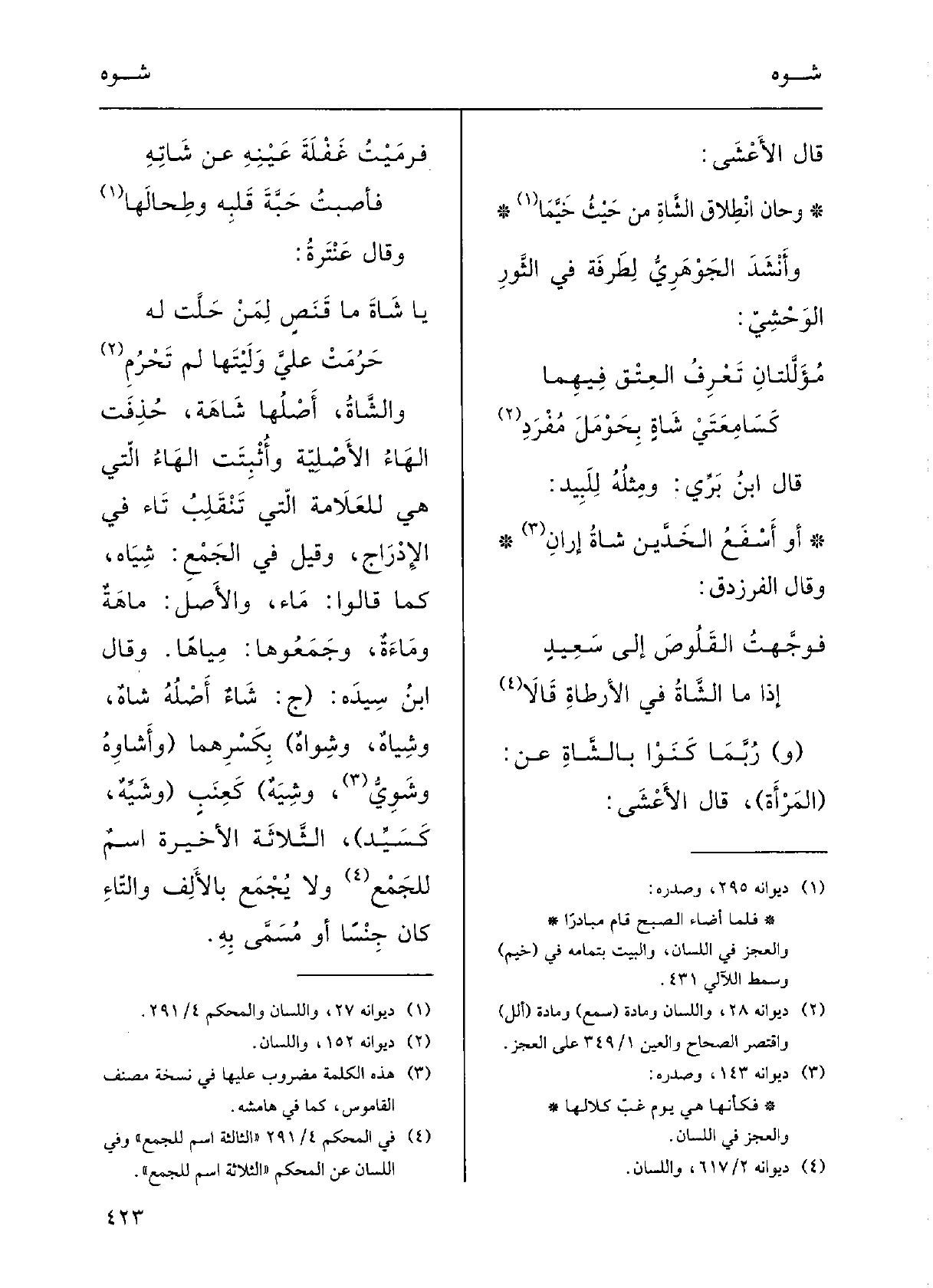 يَا شاةَ مَا قَنَصٍ لِمَنْ حَلَّتْ لهحَرُمَتْ عليَّ ولَيْتَها لم تَحْرُم {ِوالشاةُ: أَصْلُها} شاهَةٌ، حذِفَتِ الهاءُ الأصْلِيَّة وأُثْبِتَتِ الهاءُ الَّتِي هِيَ للعَلامةِ الَّتِي تَنْقَلِبُ تَاء فِي الإدْراجِ، وقيلَ فِي الجَمْعِ شِيَاهٌ كَمَا قَالُوا ماءٌ، والأصْلُ ماهَةٌ وماءَةٌ، وجَمَعُوها مِياهاً.