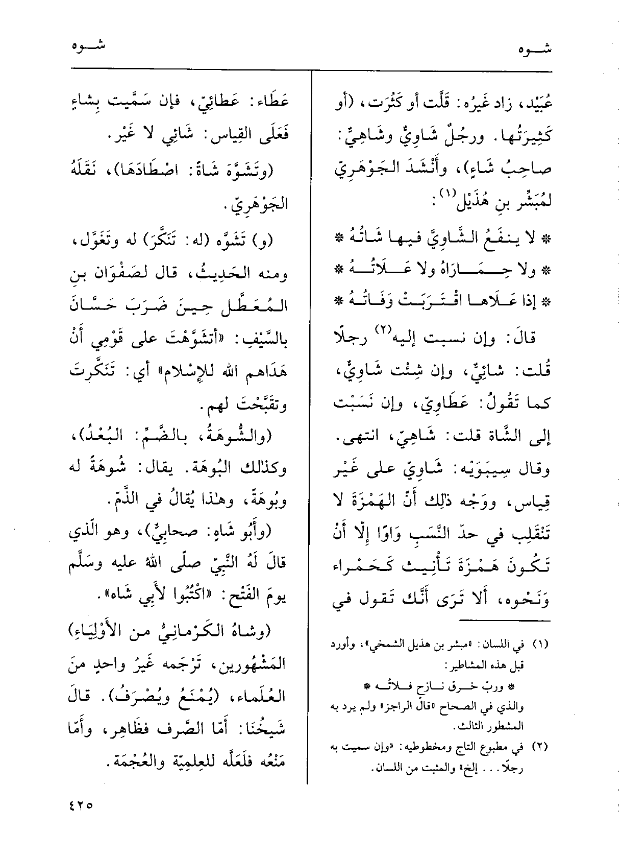 وقالَ سِيْبَوَيْه:} شاوِيٌّ على غيرِ قِياسٍ، ووَجْه ذلِكَ أنَّ الهَمْزةَ لَا تَنْقلبُ فِي حَدِّ النَّسَب واواً إلاّ أَنْ تكونَ هَمْزةَ تأْنِيثٍ كحَمْراء ونَحْوِه، أَلا تَرى أَنَّك تقولُ فِي عطاءٍ عَطائِيٌّ؟ فَإِن سَمّيْتَ {بشاءٍ فعلى القِياسِ شائِيٌّ لَا غَيْر.
