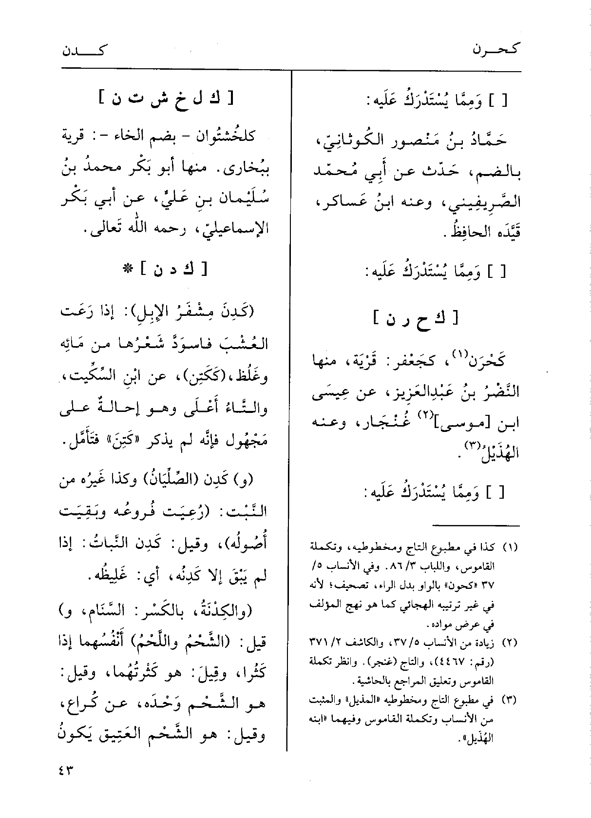 : (كَدِنَ مِشْفَرُ الإِبِلِ: إِذا رَعَتِ العُشْبَ فاسْوَدَّ شعرُها من مائِهِ وغَلُظَ، (ككَتِنَ؛ عَن ابنِ السِّكِّيت، والتاءُ أعْلَى، وَهُوَ إحالَةٌ على مَجْهولٍ فإنَّه لم يذكر كَتِنَ فتأَمَّلْ.