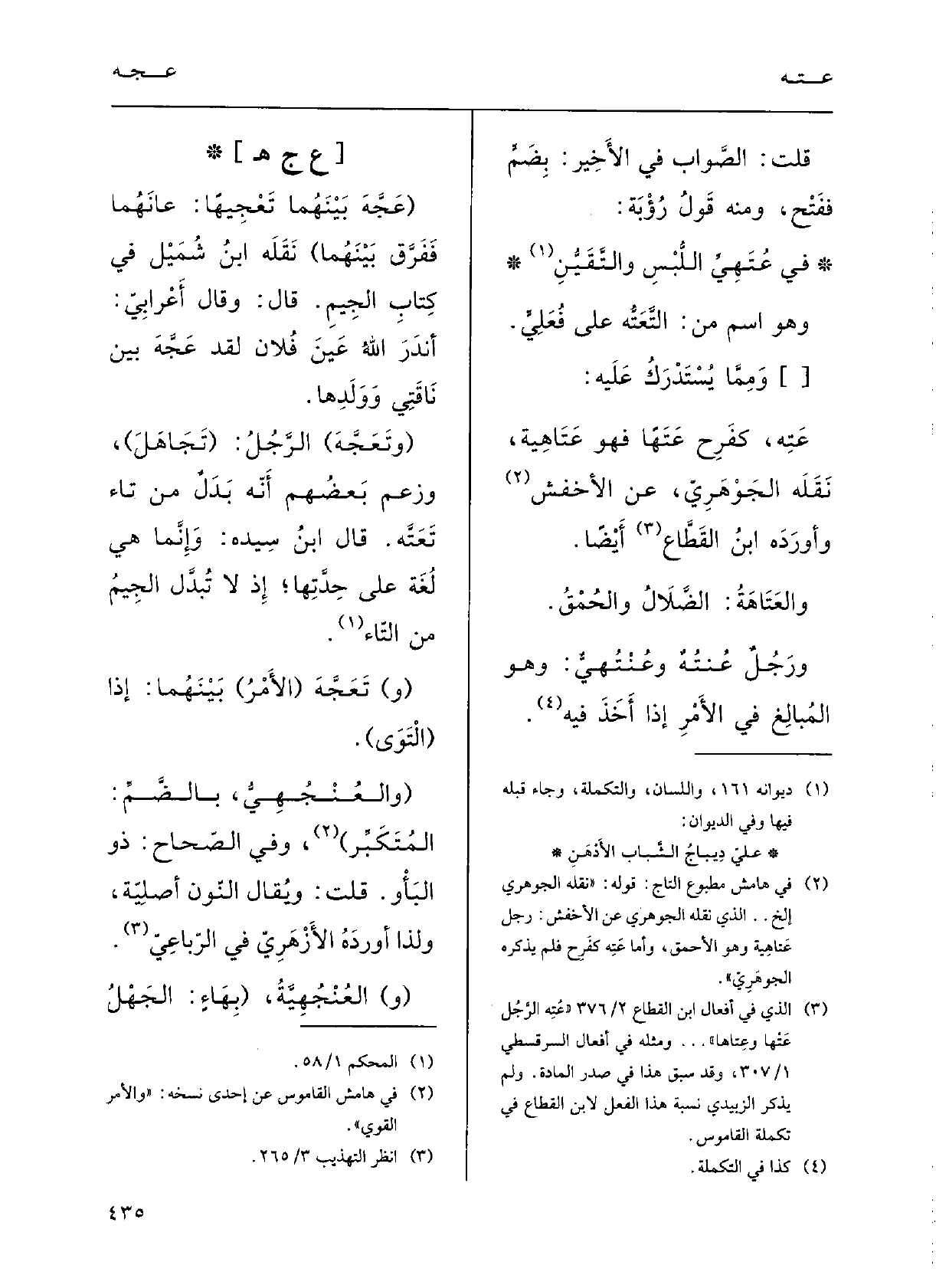 : (عَجَّهَ بَينهمَا تَعْجِيهاً: عانَهُمَا ففَرَّقَ بَينهمَا) ؛) نَقَلَهُ ابنُ شُمَيْل فِي كتابِ الجيمِ.