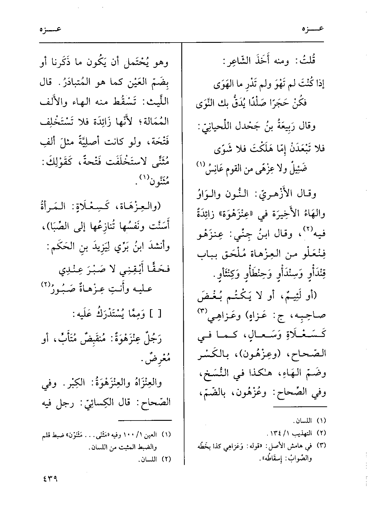 فحقًّا أَيقِني لَا صَبْرَ عنْدِيعَليْهِ وأَنْتِ عِزْهاةٌ صَبُورُ وممَّا يُسْتدركُ عَلَيْهِ: