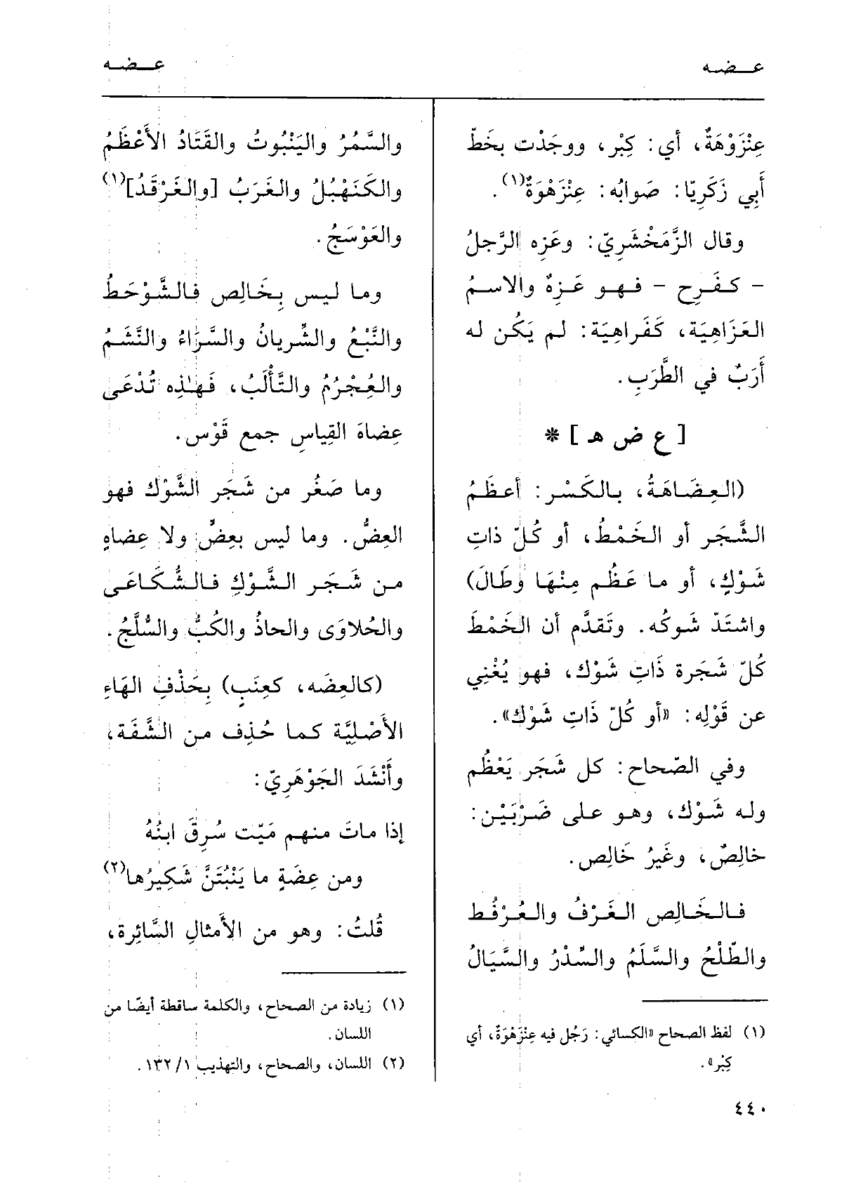 وَفِي الصِّحاحِ: كلُّ شجرٍ يَعْظُمُ وَله شَوْكٌ، وَهُوَ على ضَرْبَيْن: خالِصٌ وغيرُ خالِصٍ؛ فالخالِصُ الغَرْفُ والعُرْفُطُ والطَّلْحُ والسَّلَم والسِّدْرُ والسَّيَالُ والسَّمُر واليَنْبُوتُ والقَتادُ الأعْظَمُ والكَنَهْبُلُ والغَرَبُ والعَوْسَجُ؛ وَمَا ليسَ بخالِصٍ فالشَّوْحَطُ والنَّبْعُ والشِّرْيانُ والسَّرَاءُ والنَّشَمُ والعُجْرَمُ والتَّأْلَبُ، فَهَذِهِ تُدْعَى عِضاهَ القِياسِ جَمْعُ قَوْسٍ، وَمَا صَغُرَ من شجَرِ الشَّوْكِ فَهُوَ العِضُّ، وَمَا ليسَ بعِضَ وَلَا عِضاهٍ من شجَرِ الشَّوْكِ فالشُّكَاعَى والحُلاوَى والحاذُ والكُبُّ والسُّلَّجُ.