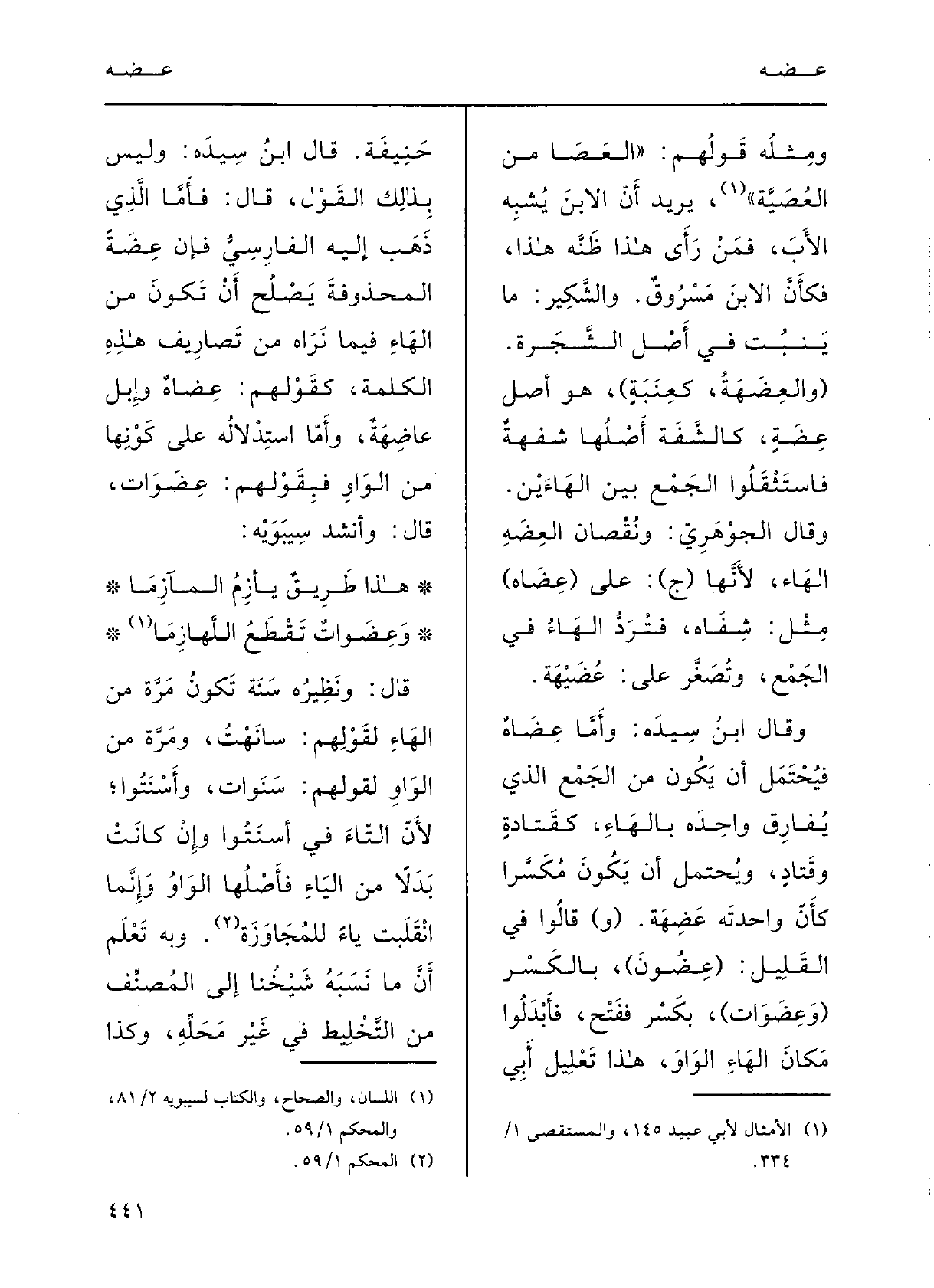 قالَ ابنُ سِيدَه: وليسَ بذلكَ القَوْل، قالَ: فأَمَّا الَّذِي ذَهَبَ إِلَيْهِ الفارِسِيُّ فإنَّ عِضَةً المحْذوفَة يَصْلُح أَنْ تكونَ مِنَ الهاءِ فِيمَا نَراهُ مِن تَصارِيفِ هَذِه الكَلِمَةِ كقَوْلِهم عِضاهٌ وإِبِلٌ عاضِهَةٌ، وأَمَّا اسْتِدْلالُه على كوْنِها مِن الواوِ فبقَوْلِهم عِضَواتٌ؛ قالَ: وأَنْشَدَ سِيْبَوَيْه: