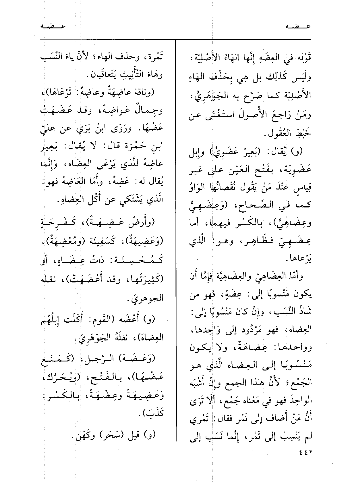 قَوْلُه فِي العِضَهِ أَنَّهَا الْهَاء الأصْلِية وليسَ كَذلِكَ، بل هِيَ بحذْفِ الهاءِ الأصْلِية كَمَا صَرَّحَ بِهِ الجوْهرِيّ، وَمن راجَعَ الأصُولَ اسْتَغْنى عَن خَبطِ العُقُولِ.
