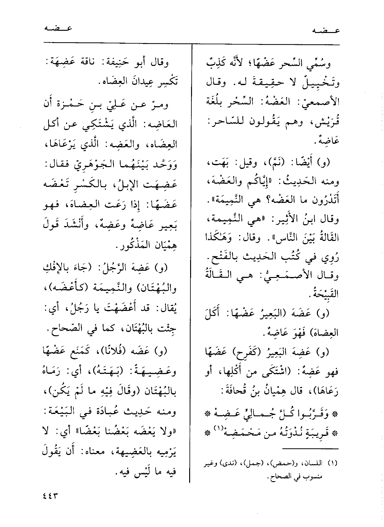 ومَرَّ عَن عليٌّ بنِ حَمْزَةَ أَنَّ العَاضِهَ الَّذِي يَشْتَكِي عَنْ أَكْلِ العِضَاه، والعَضِهُ الَّذِي يَرْعَاهَا.