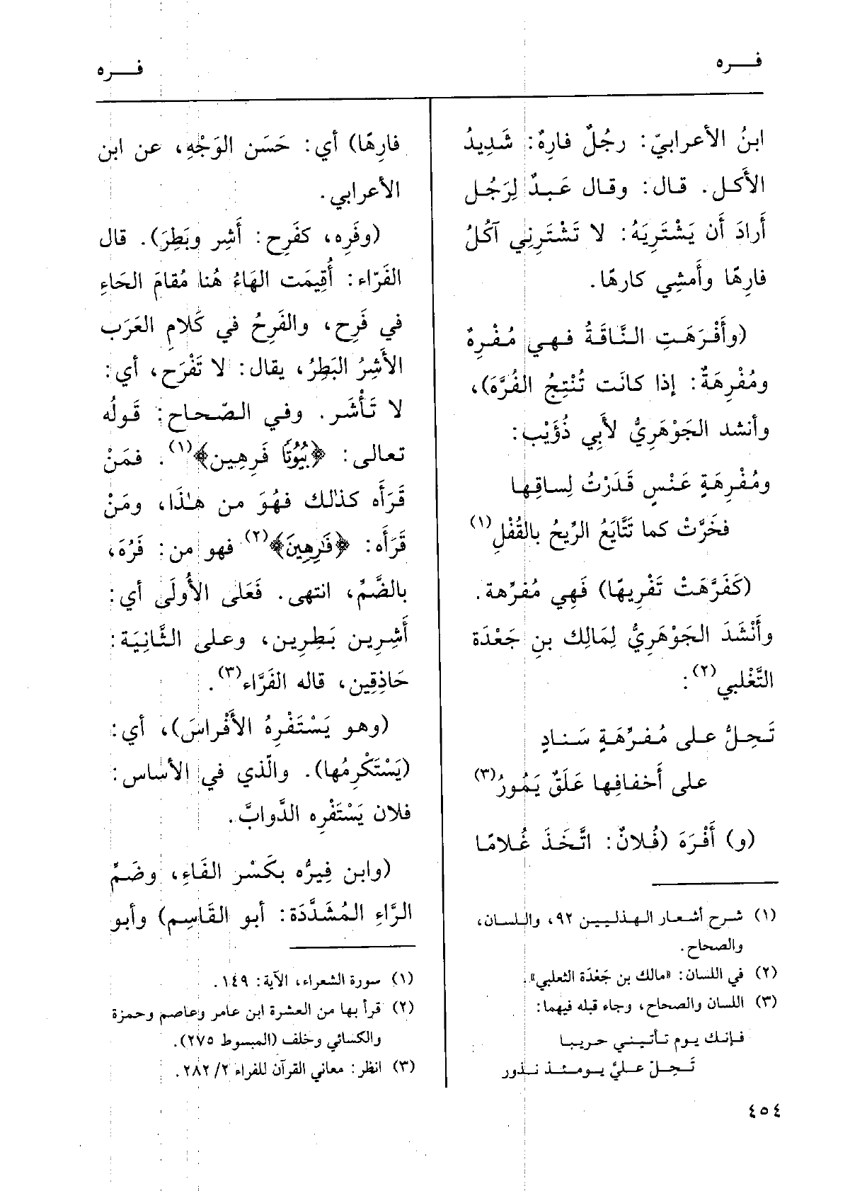 وَفِي الصِّحَاحِ: قَولَه تَعَالى: {بُيُوتًا فرِهِين} ، فَمَنْ قَرَأَهُ كَذَلِكَ فَهُو مِنْ هَذَا، وَمَنْ قَرَأَهُ {فارِهِينَ} فَهُوَ من فَرُه، بالضِّمِ، انتهَى.