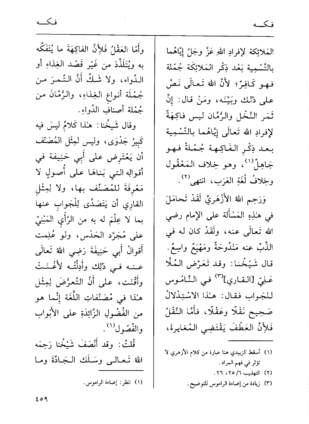 قَالَ شَيْخُنَا: وَقَدْ تَعَرَّضَ الملا عَلَيَّ فِي النَّامُوسِ للجَوابِ فقالَ: هَذَا الاسْتِدْلاَلُ صَحِيحٌ نَقْلاً وَعَقْلاً، فَأَمَّا النَّقْل فلأَنَّ العَطْفَ يَقْتَضِي المُغَايَرَة، وأَمَّا العَقْل فلأَنَّ الفَكِهَةَ مَا يَتَفَكَّهُ بِهِ ويُتَلَذَّذُ من غَيْرِ قَصْدِ الغذاءِ أَوِ الدَّوَاءِ، وَلَا شَكَّ أَنَّ التَّمْرَ مِنْ جُمْلَةِ أَنْوَاعِ الغِذاءِ، والرُّمَّانِ من جُمْلَةِ أَصْنَافِ الدَّوَاءِ.